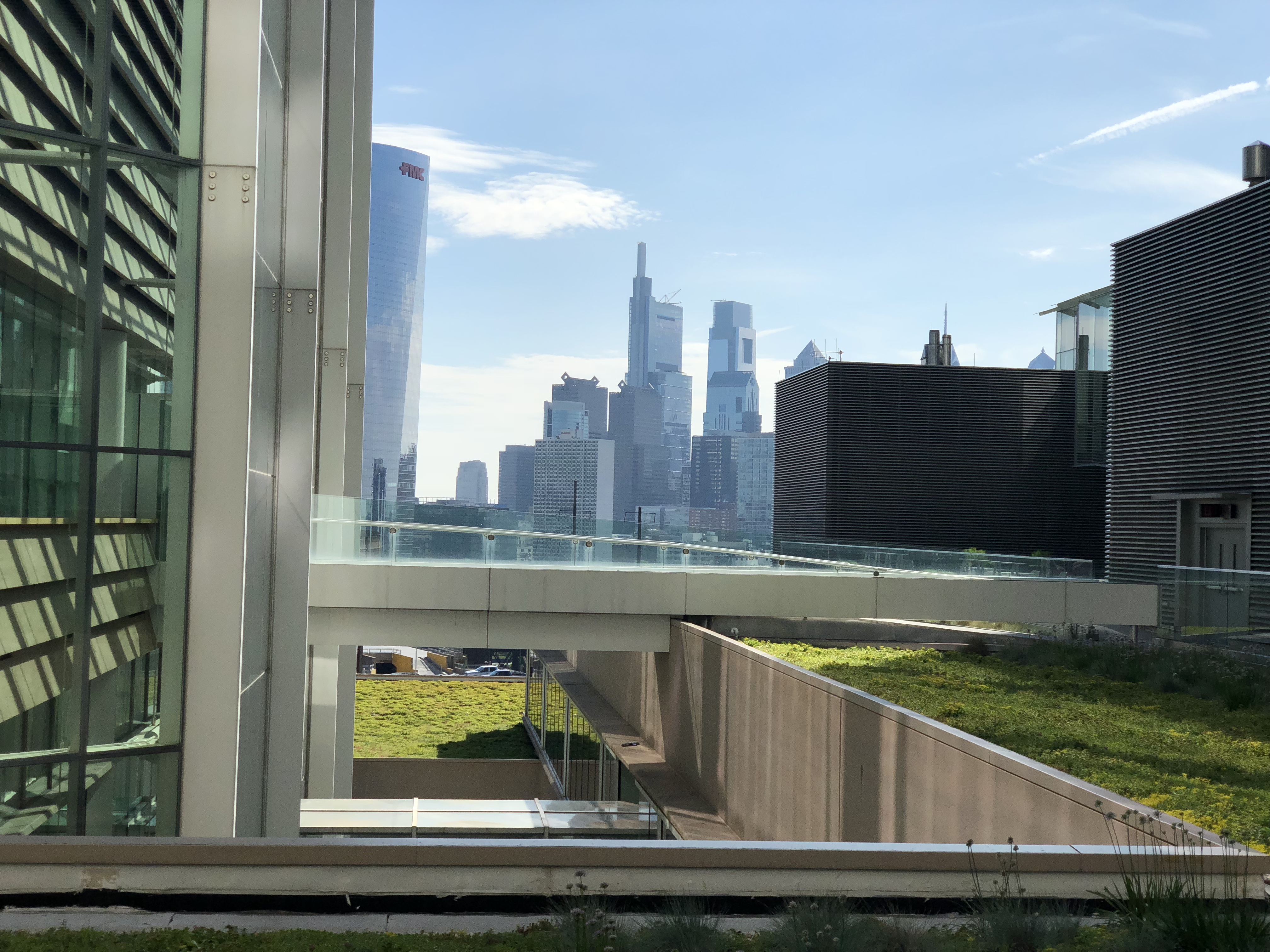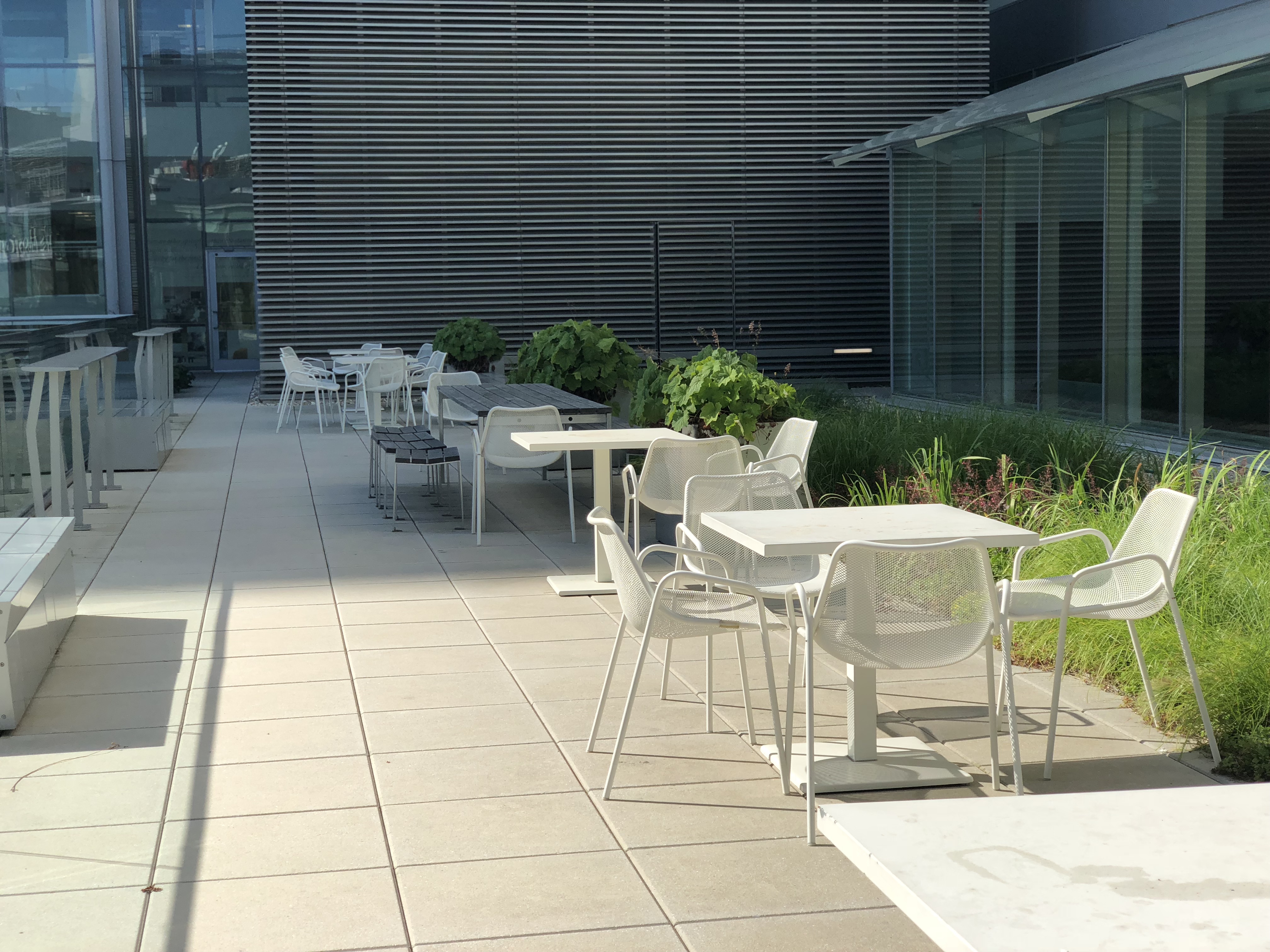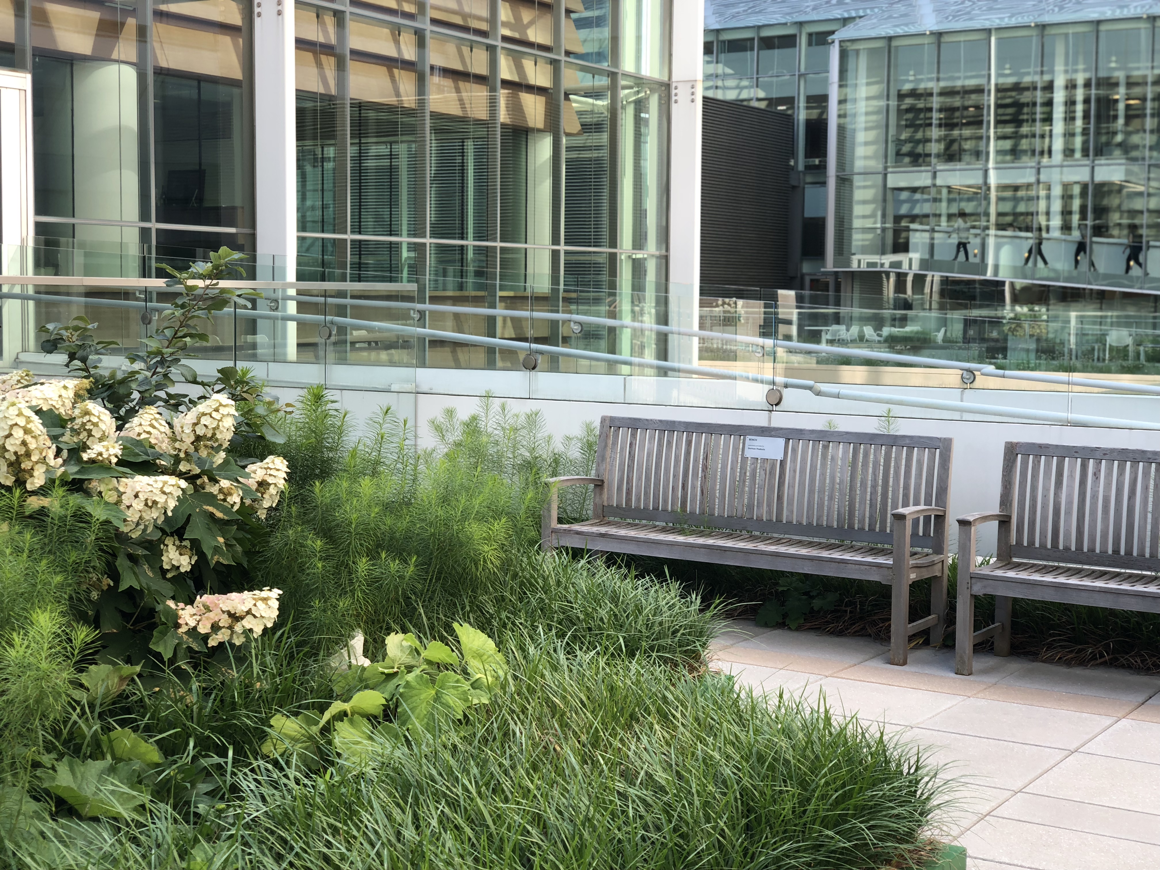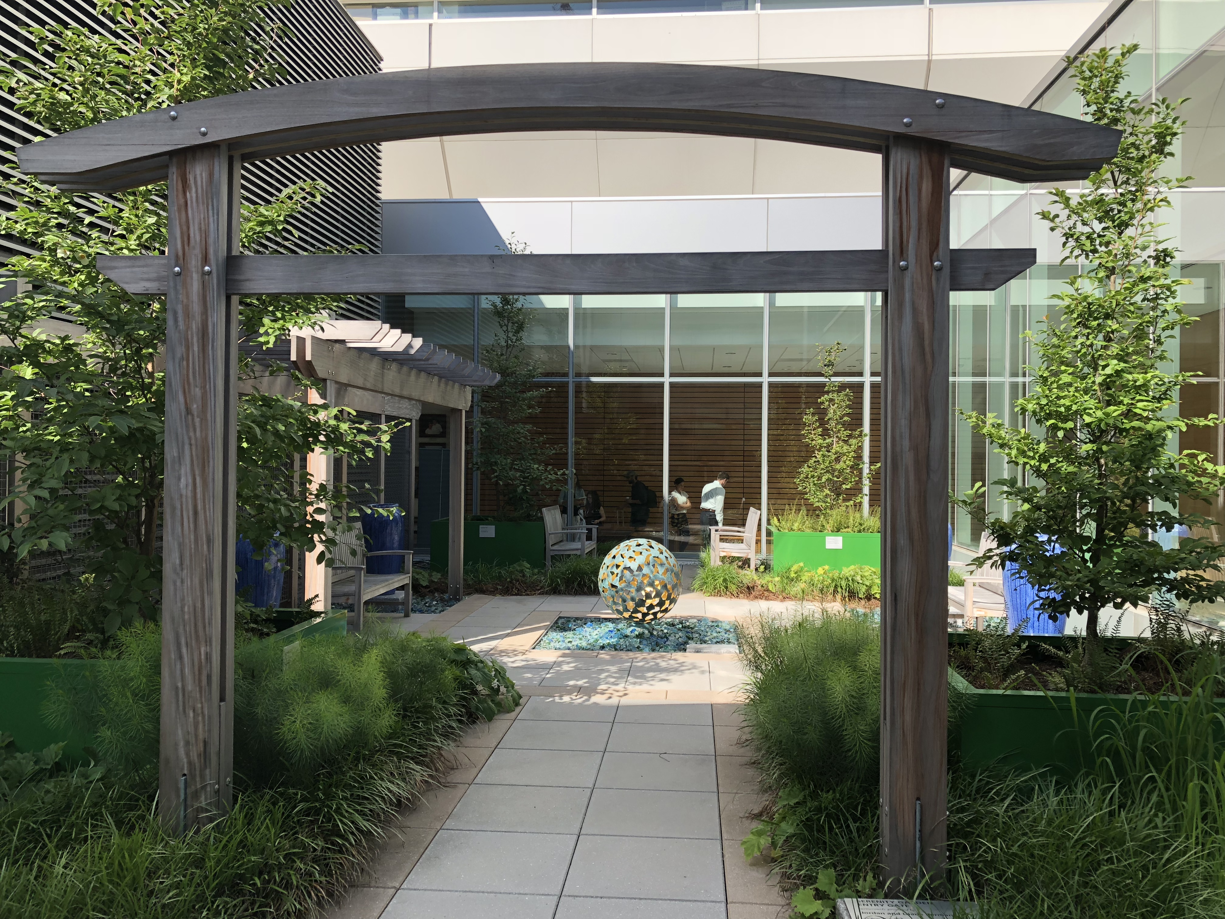 Sitting atop the Perelman Center for Advanced Medicine (PCAM) building at the University of Pennsylvania is a rooftop garden that few students, faculty, staff, and visitors are aware of its existence. The garden was gifted to the University by the Berman and Goodman Families, two local prominent Philadelphian philanthropists. As a staff member, I occasionally walk through the garden to get from one building to another building, thanks to the ingenuity of the designers who had the foresight to build connecting bridges on top of the buildings so that the space actually gets used. I have rarely, if ever, sat down in the garden for leisure activities, such as eating lunch or just to relax. Today, I came out here to find inspiration for the #WednesdayYellow photography challenge. I found this spherical sculpture on the side of the garden which is my official entry into the contest.