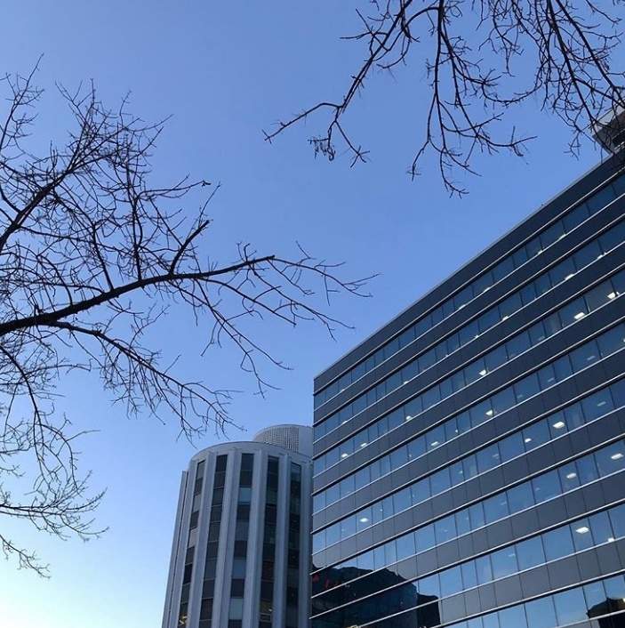 the trip to the city which is like a photo above some tree trees that grow around the city environment has fallen flowers, around this area is also filled with magnificent and large buildings.