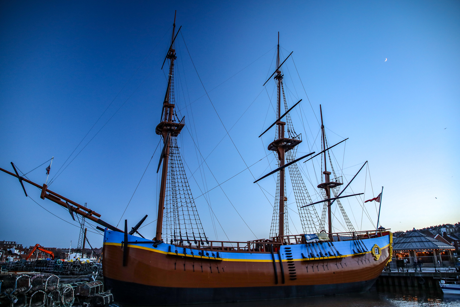 This ship is a restaurant and tourist attraction moored in the Whitby Harbour.