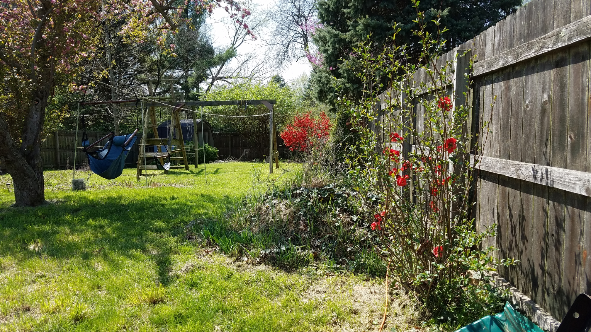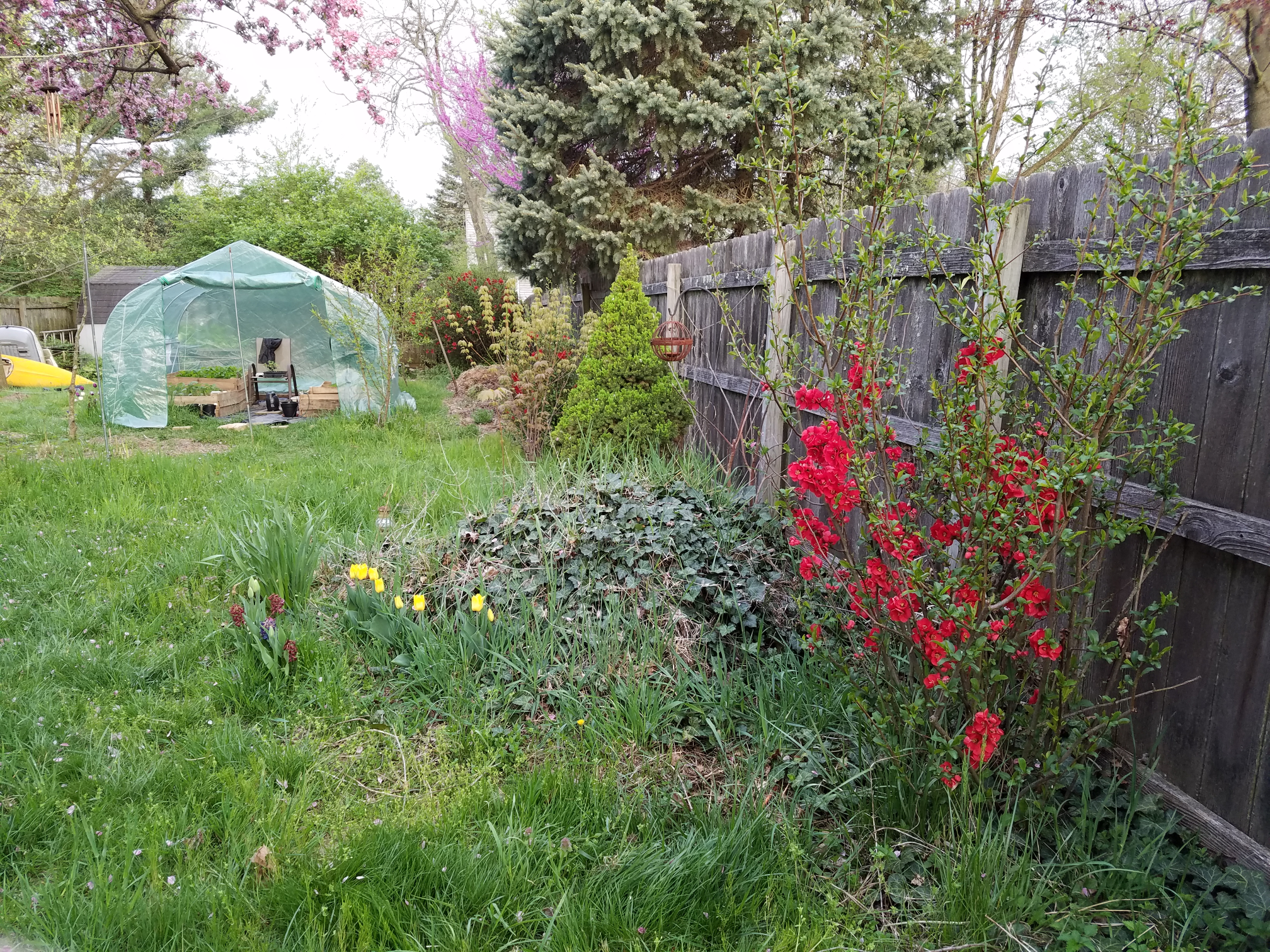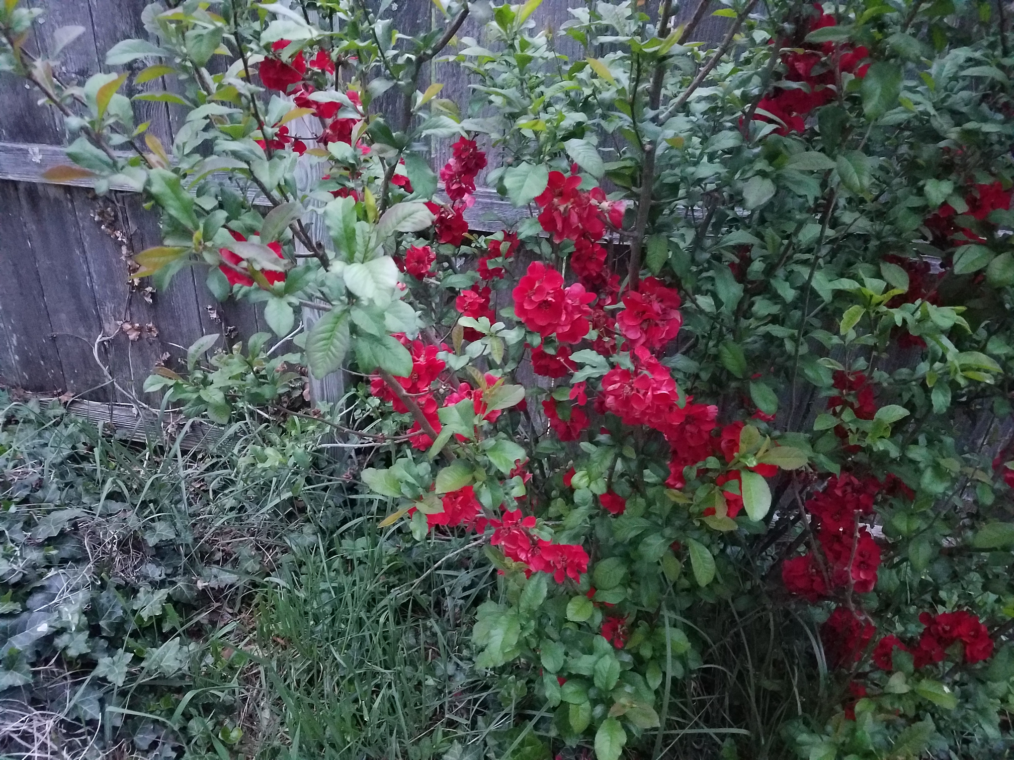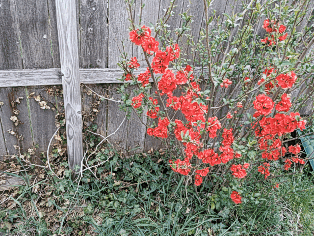 Here's a picture of the three bushes—red flowers blooming, along the north side of my yard in the Spring of 2017, a couple of years after transplant. The bush in the foreground is the one that has produced the fruit. The middle bush is barely visible. The bush farthest away is the oldest. As you can see, in 2017 the oldest bush produced the most flowers and the (foreground) newest one the least. The middle bush (the one I moved from the shady side of the yard to the sunny side) is almost not even visible.
