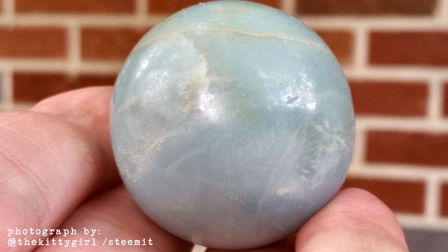 I find the soft, pale color of this specimen of Amazonite to be pretty, calming, and delightful to hold and examine. There are delicate, whitish lines running around the sphere in various patterns which I find fascinating. The whitish streaks are another mineral, albite, that has grown alongside the Amazonite. Thanks for looking at this lovely sphere with me! 😊