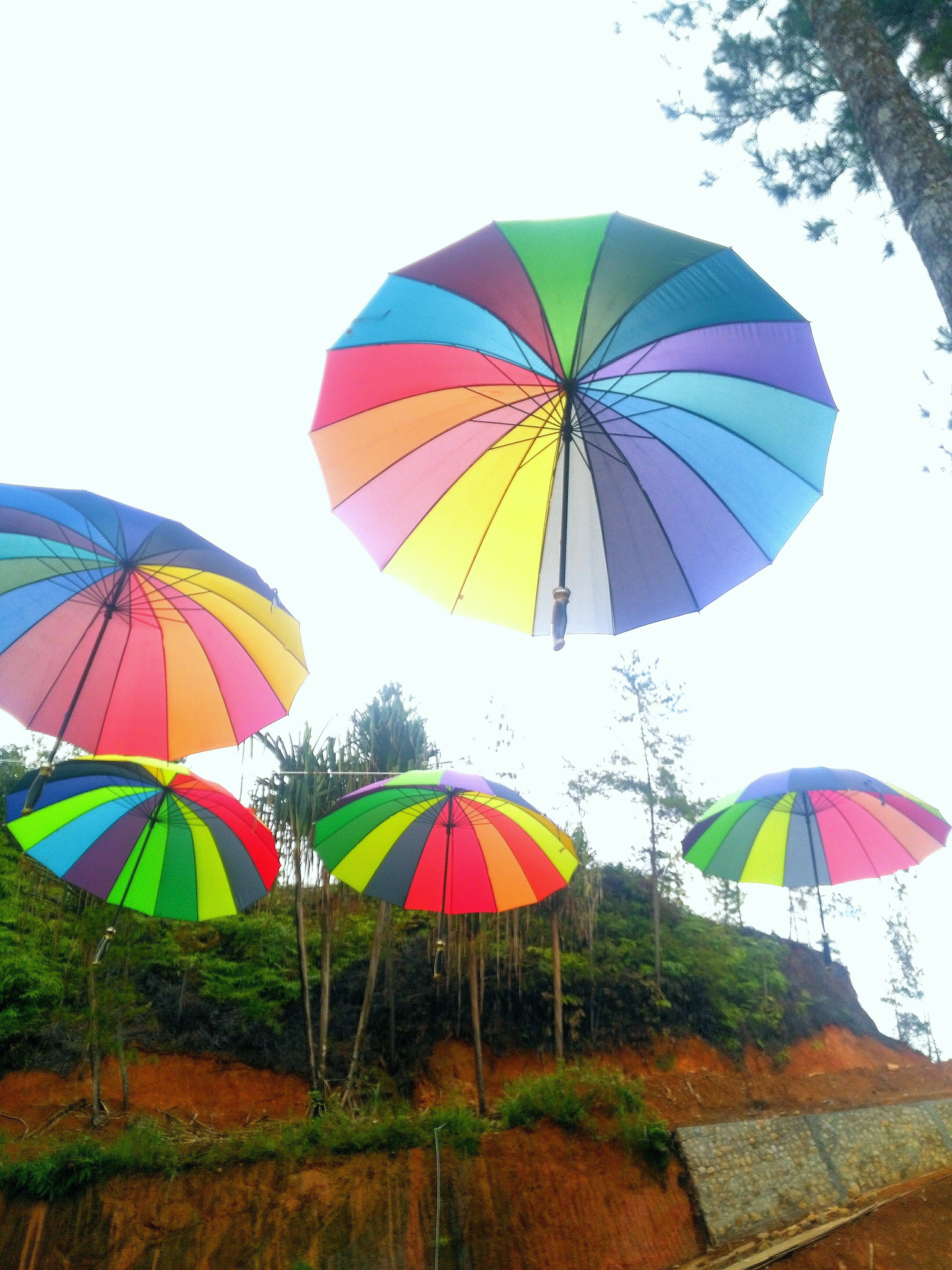 Momen ini saya ambil di lokasi D'Ground Cafe Puncak gunung salak Kabupaten Aceh Utara dengan menggunakan kamera handphone Huawei GR5. Payung ini di gantung diantara pepohonan dengan menggunakan tali, saya mengambil gambar dari bawah mengarah awan agar tali payung tersebut tidak terlihat, sehingga hasil gambar yang diambil payung ini terlihat seperti terbang.