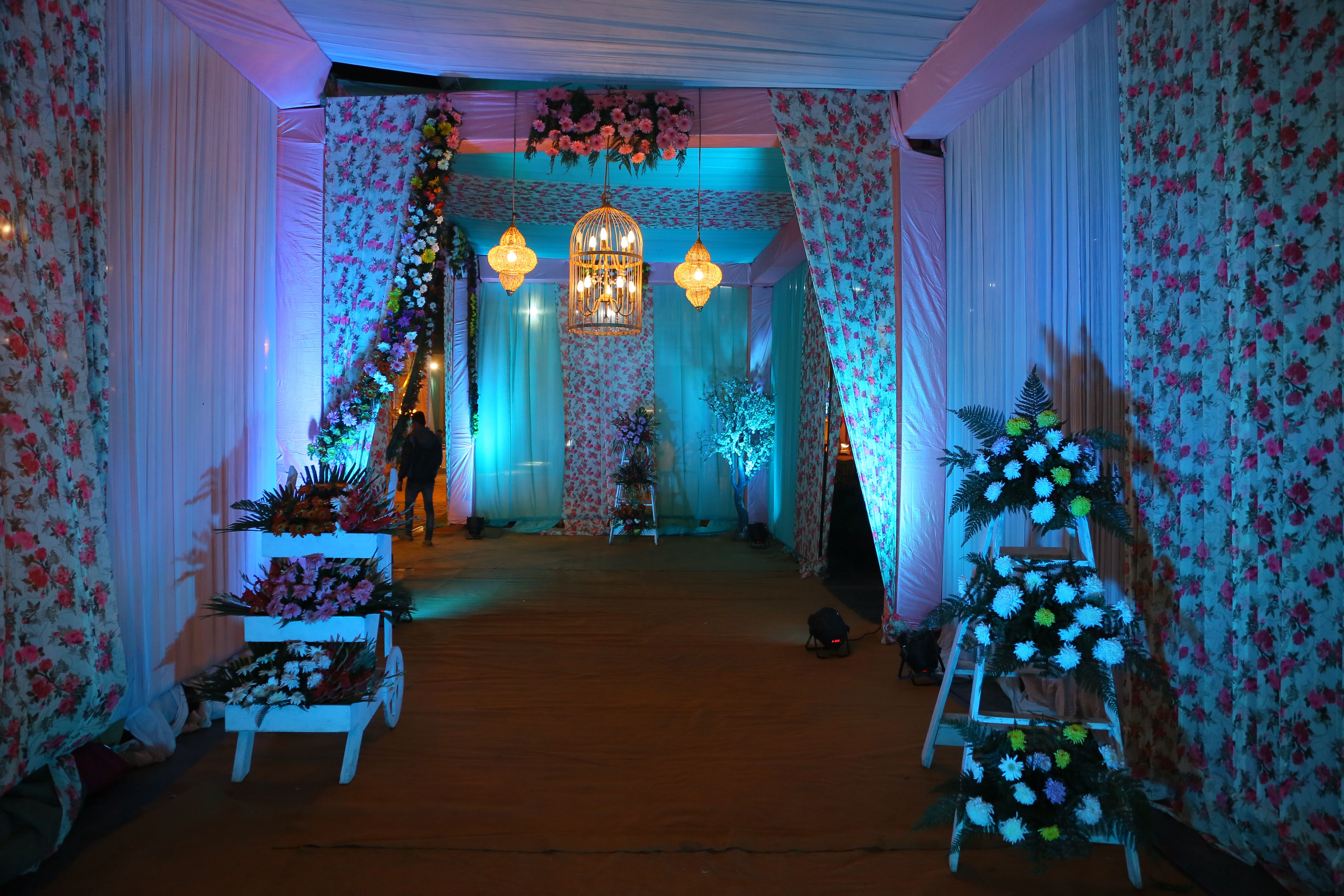 colourchalleng friday sky-blue: wedding reception gate. This is my entry today #colourchalleng sky-blue in entry gate . reception party entry gate decoration is very beautiful flower and hanging lights bulb on gate. White and yellow boutique is changing the all picture.