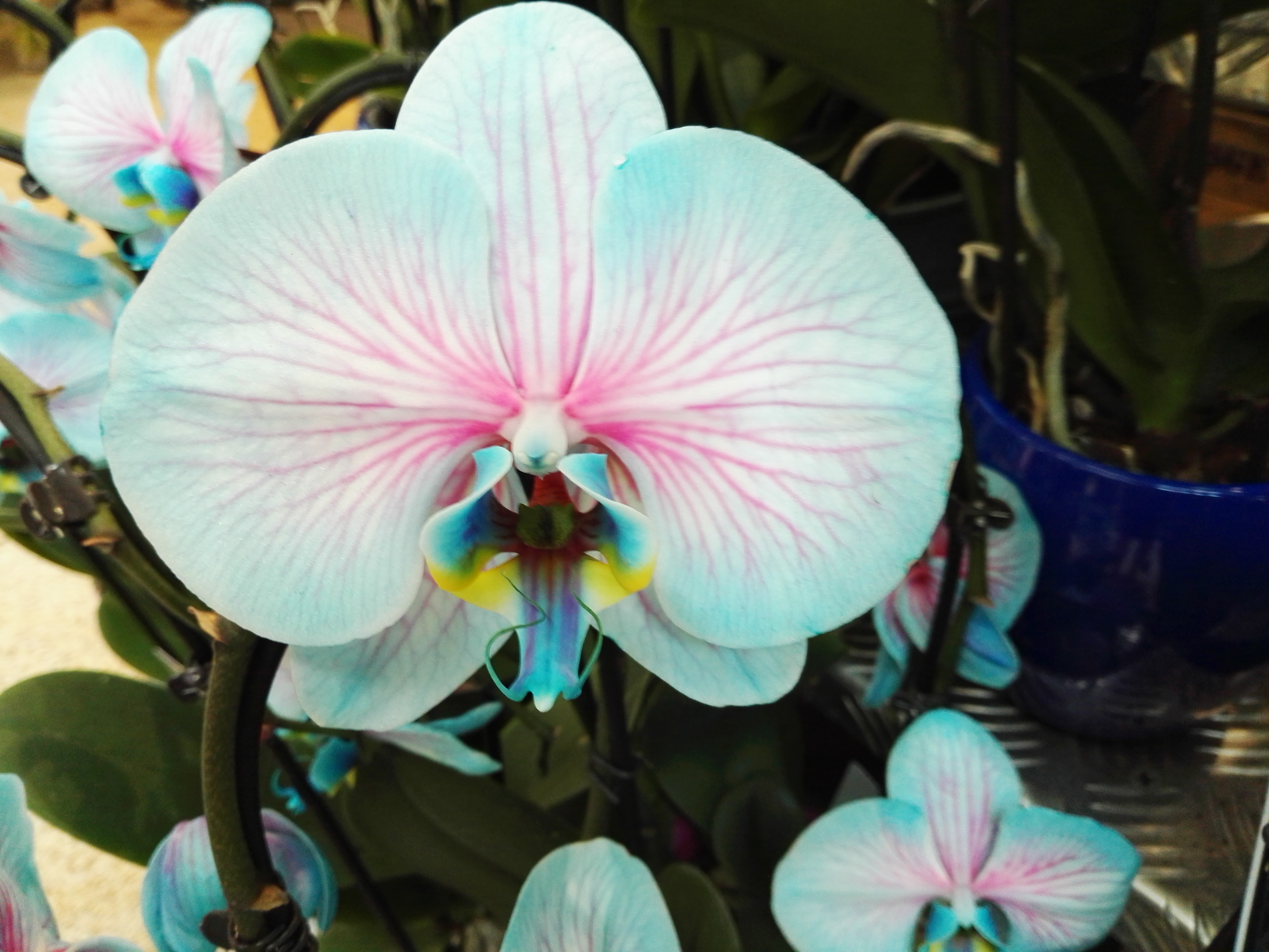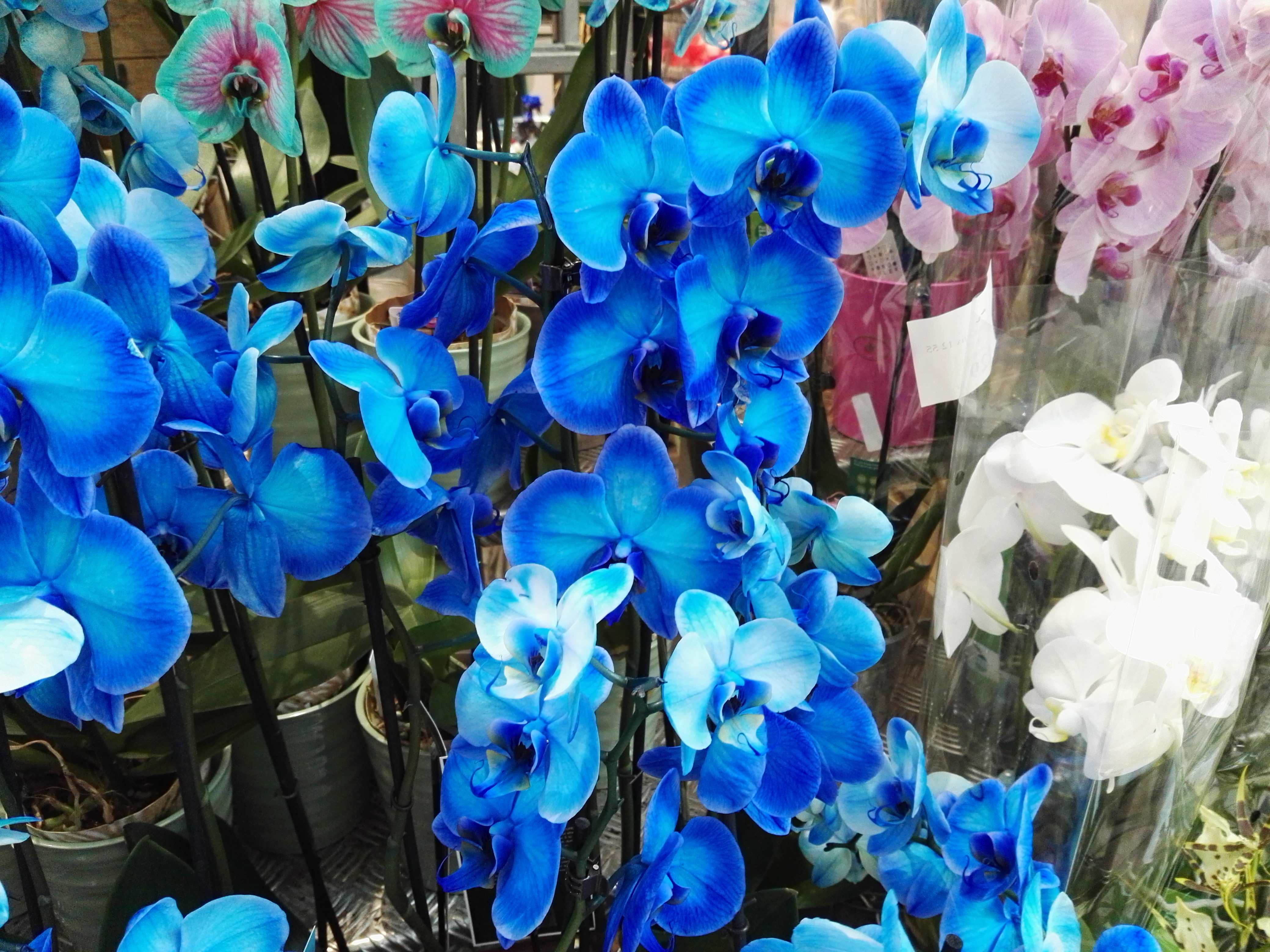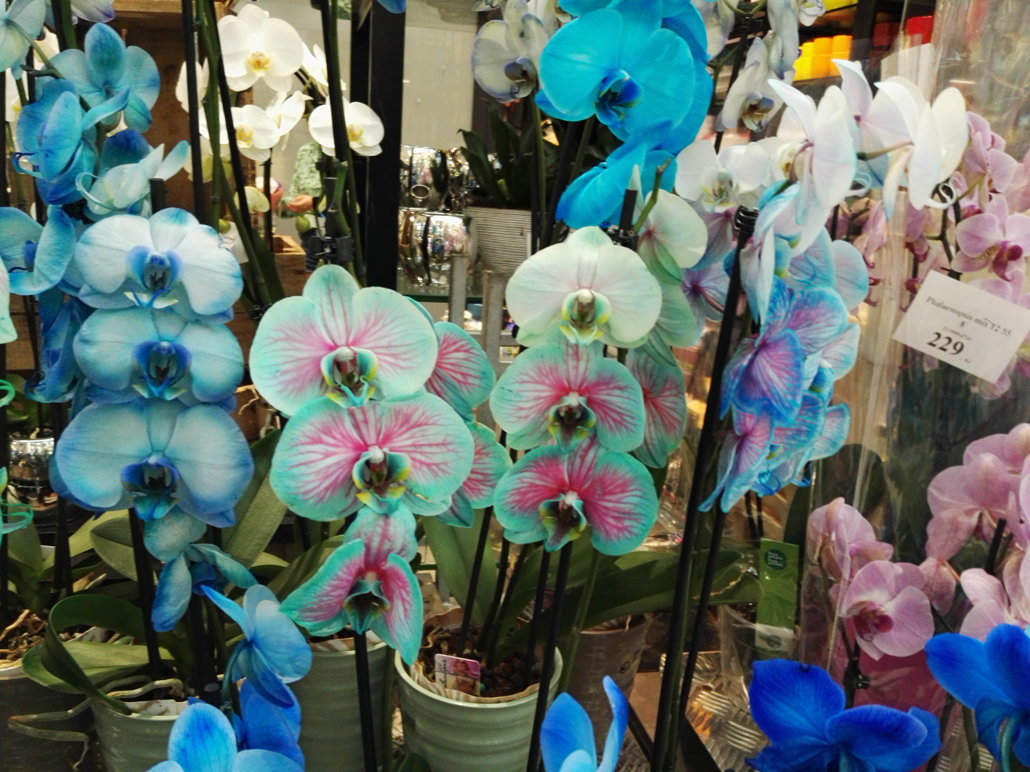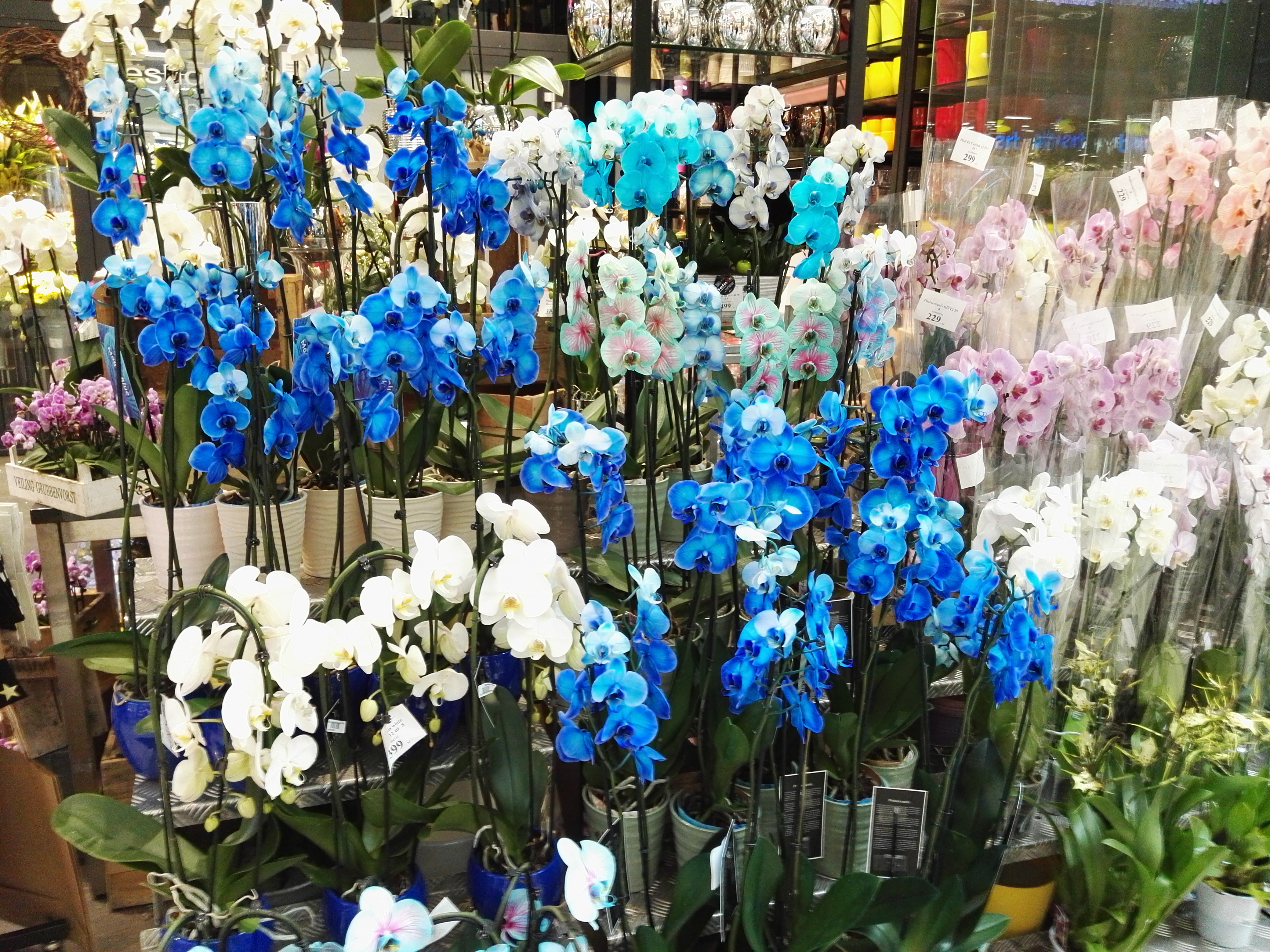 I love flowers and orchids, although they are not my favorites, I like quite much. They are beautiful because they remind you of how wonderful nature is and what beauty it can create. I'm sure the one who made these orchids had a lot of work with it, but the pure beauty of nature has somehow disappeared in that artificial blue. What do you think, a bit psychadelic, right? And yes, they are real, not plastic! :-)