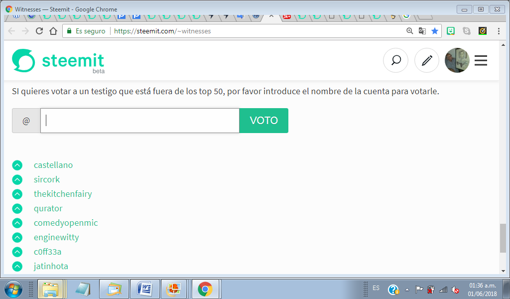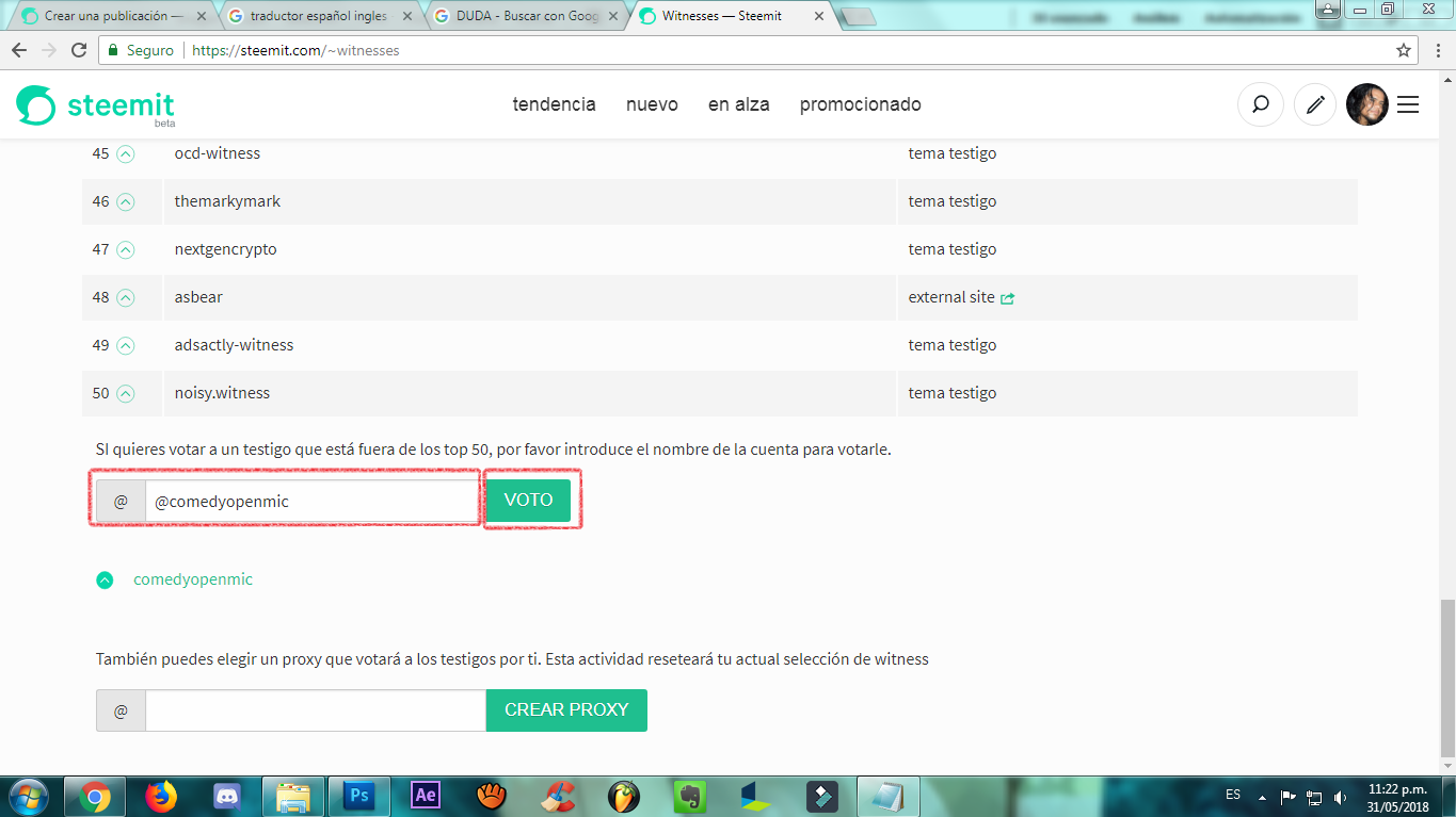 Para dar el valioso voto es muy fácil, Solo debes ingresar a https://steemit.com/~witnesses y en la parte inferior encontrarás un panel de texto con un botón que dice "VOTO" en el panel de texto debemos colocar el nombre de @comedyopenmic y luego le damos VOTO