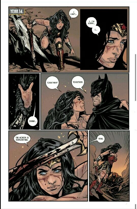 Basically, the premise is that bats and wondie went tohelp an old friend (the gentle man..weird name, iknow!) Who had been fighting a never-ending horde of creatures from anofher dimension for the better part of a millennia and he needed a break, the thing is, time passes differently in said dimension...the millennium which he spent was just about 3 months in our own dimension. Both bats and diana had no idea about the time issue and were both stuck there for about 37 years total.i'm not going to spoil more of the story for those who have not read the book but i did warn you. My issue with the arc is that both bats and wonder woman should not be in a scenario like this in the first place, the first issue ended with a cliff hanger where they were both about to kiss each, this recieved a negative uproar from all fans as batman just got engaged.