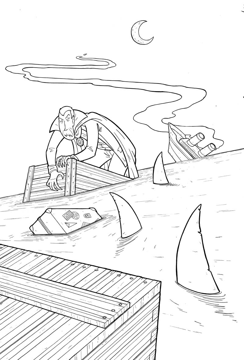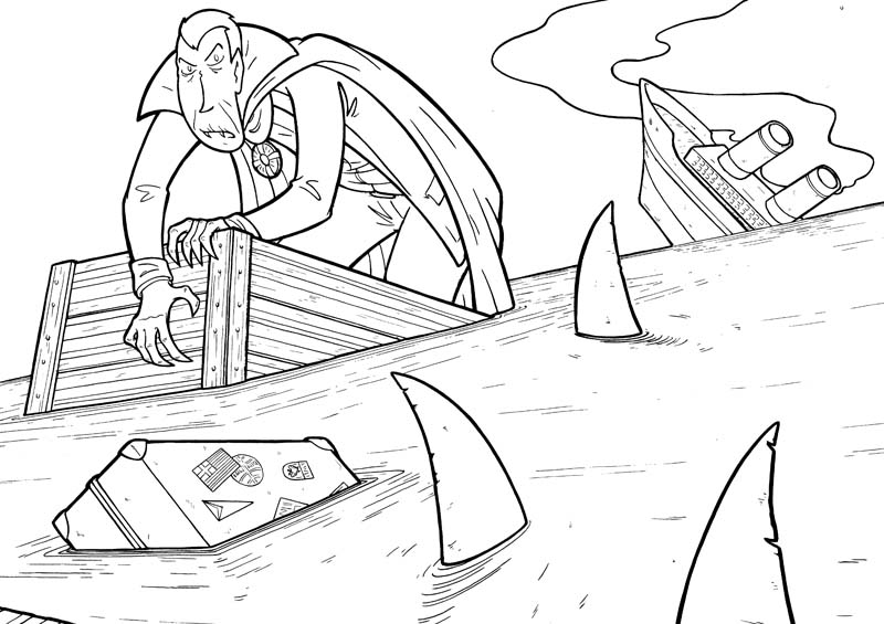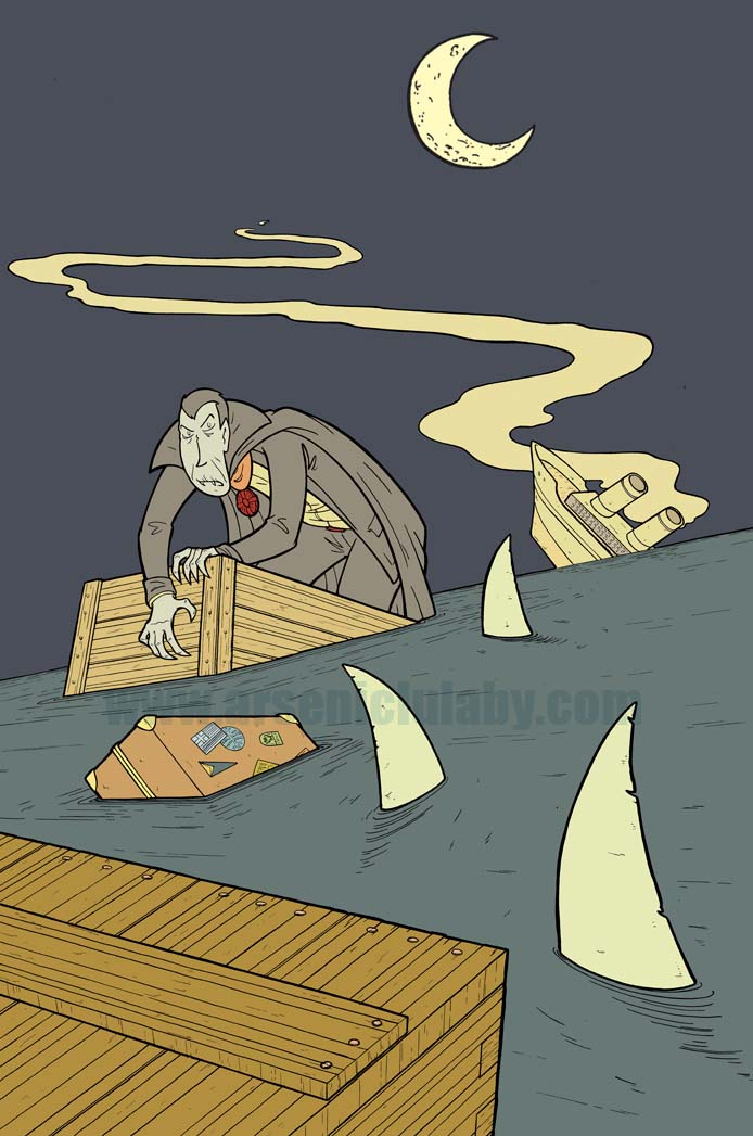 really a great drawing! it is ironic that a creature like a vampire that usually looks for blood is hunted by sharks that can smell blood from a long distance