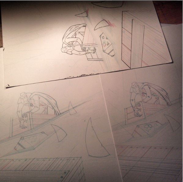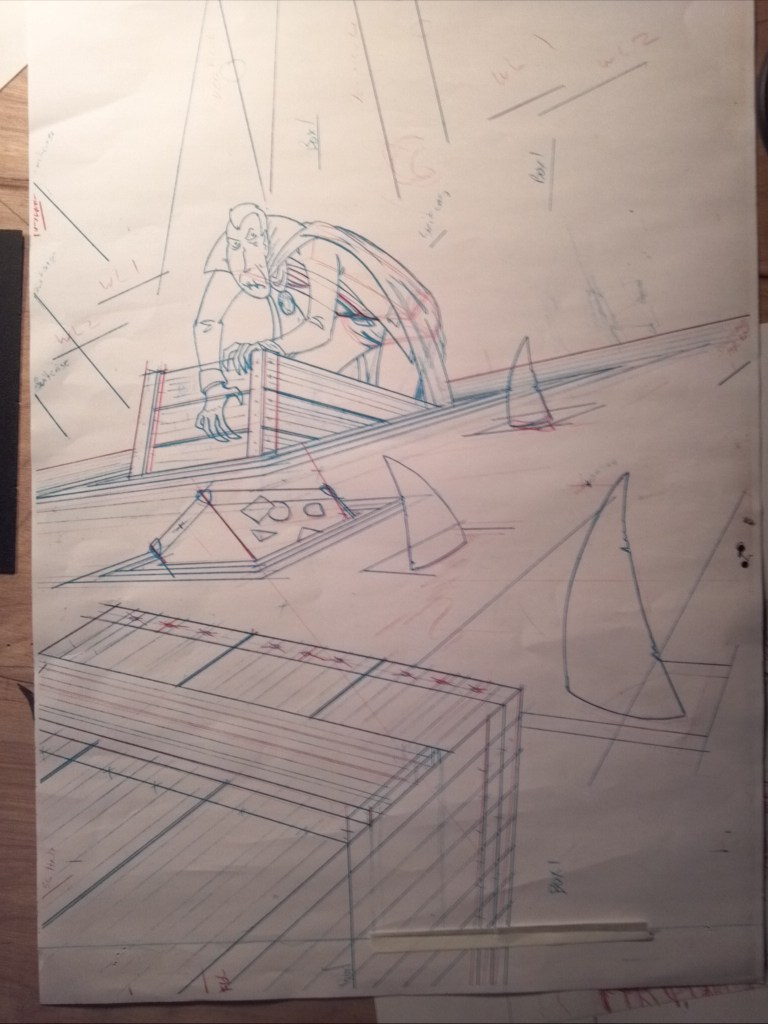 I think the only one I’m struggling with is that suitcase... The crates I get, but is there any reason not to wing the suitcase? There’s just no interior lines that needed the vanishing points. It looks like there may have been a metal banding that was omitted for the finished inks though.
