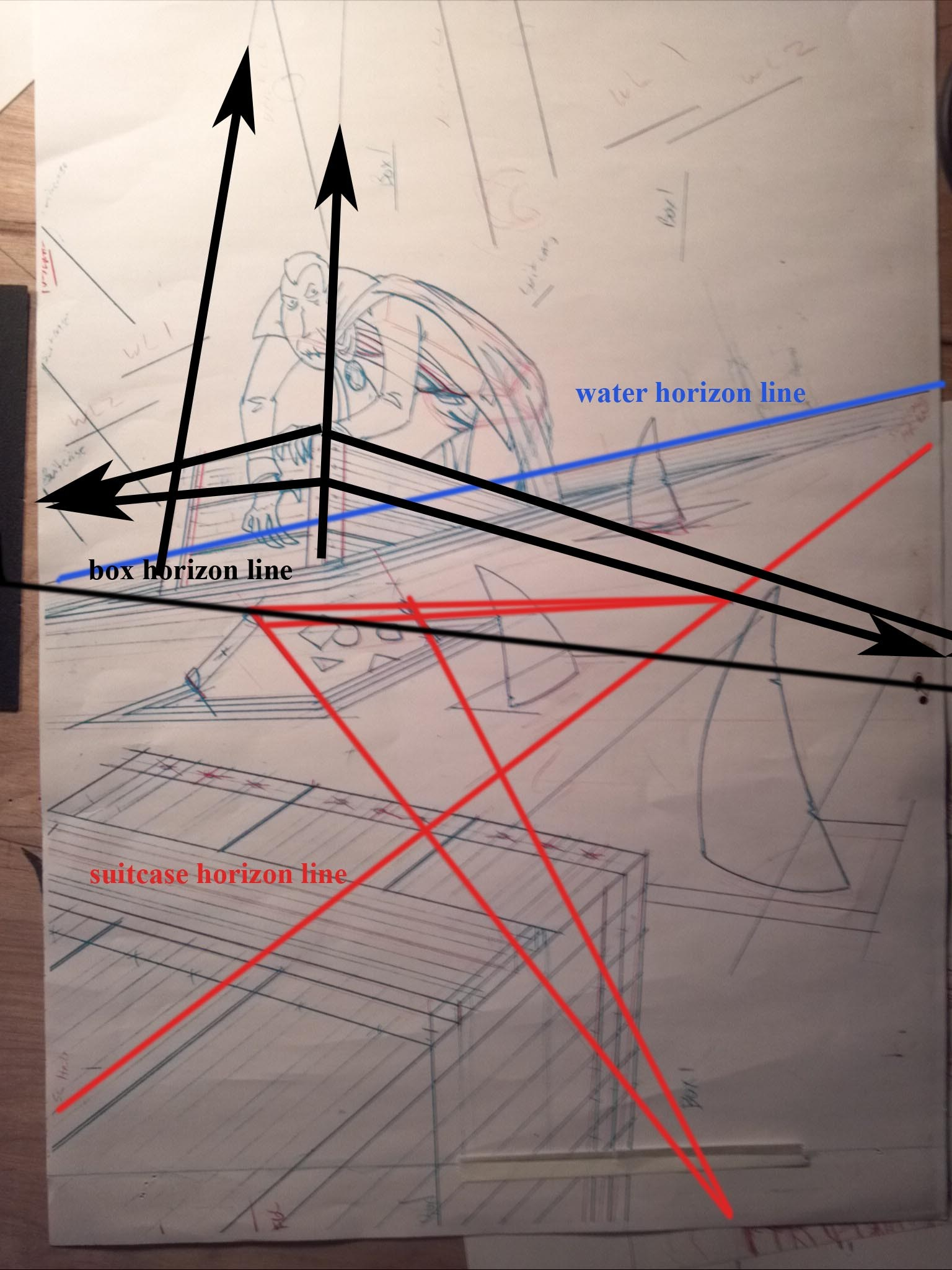 Now, because the box and suitcase are floating and sinking in slightly different directions and not actually perpendicular or parallel like say two boxes on the same floor, they each need a different horizon line and vanishing point. The suitcase for example is sinking so it’s top is closer to you then it is to bottom. Easy enough, add an extra set of points for each item. ( I know that is tough to get your head around when I explain it with text, so just look at the pic below…if everything was on say, a floor instead of a plane that can be broken like water, everything could share the same horizon line. once something breaks a plane though it get it’s own plane/horizon line that tilts and is separate from the rest……eh, just look at the pic)