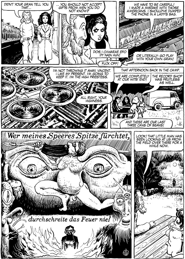 Gwendolyn probably should've thrown the figurine away, but now Vincent and she is being followed by a drone, and a mystical man appears at their campsite at Harold & Heather's Touring Park. The text in the low left frame is from Richard Wagners opera, Die Walküre (The Valkyrie). It is the last words of the opera where Wotan commands the fire of Loge to engulf the resting place of his daughter, the valkyrie Brünhilde. The piece is famously known as Feuerzauber - Fire Magic!