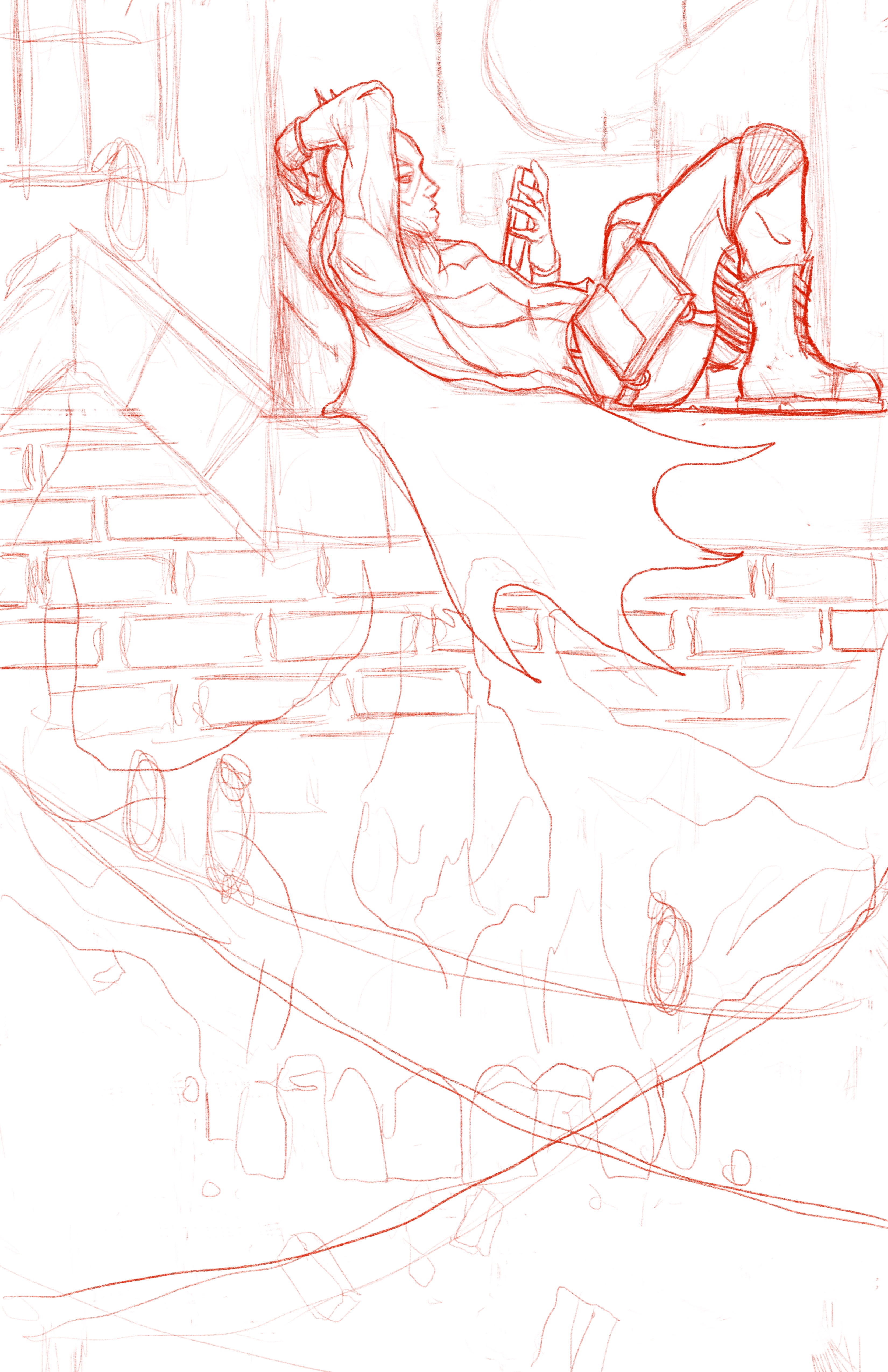 And finally, last nights sketch! Most nights, somewhere around midnight or 1am, I put away all of my commission work and either work on personal projects, just just sketch for fun. Last night I was into the idea of drawing Batgirl. I’ve been reading Batgirl and the Birds of Prey via the DCU app, which is awesome and totally worth the money. I wanted to try and capture the modern youthful nature of the character, as well as some added menace. The idea is that the bricks of the building will transition in to a skull. Jock has done some stunning cover work for the Batman world, a few issues of which I managed to scoop up at a garage sale yesterday, so I wanted to have a solid and interesting design element to it as well. Again, not super sure when or if I’ll bring this one to a finished state, but it seems likely.