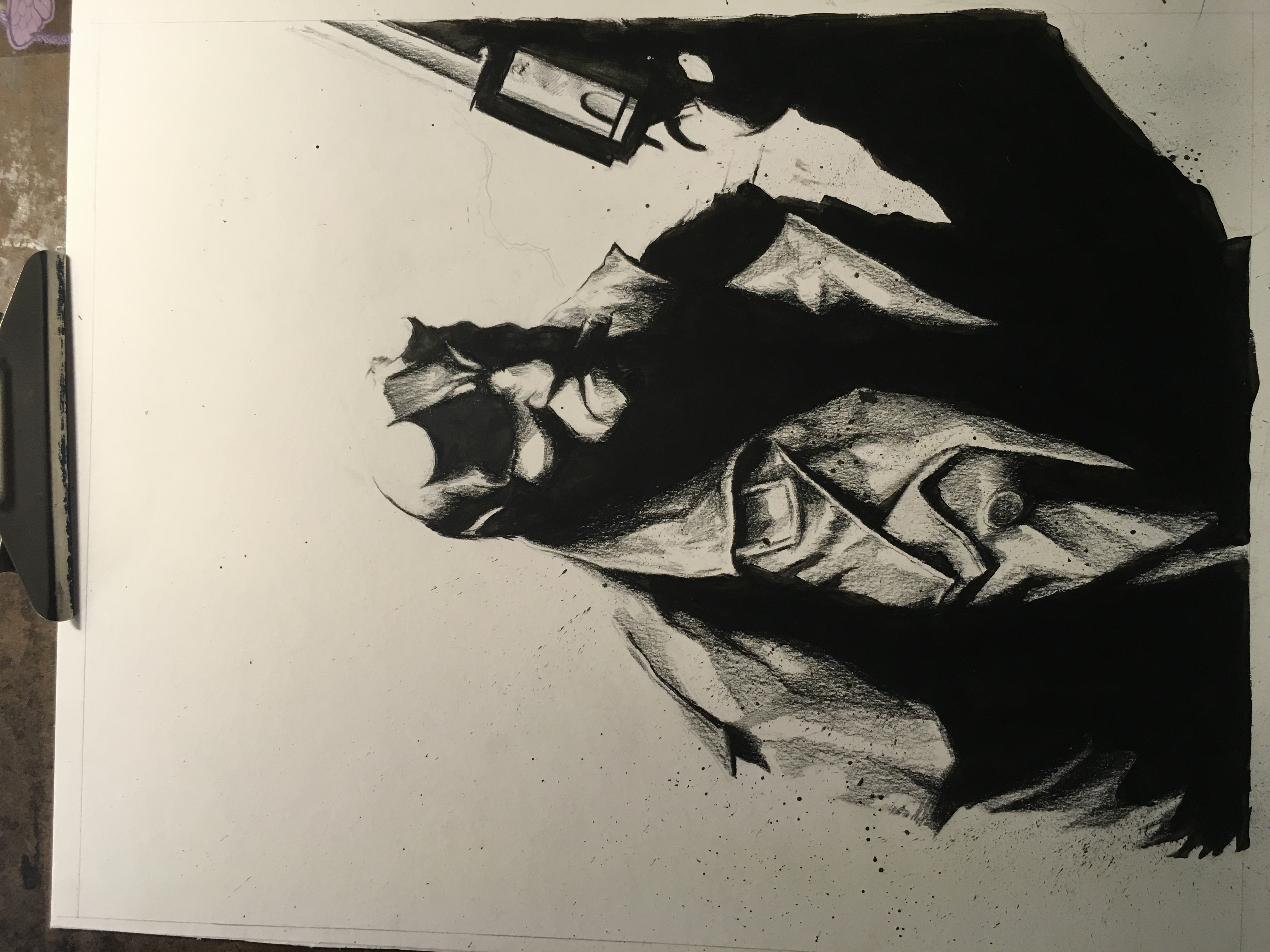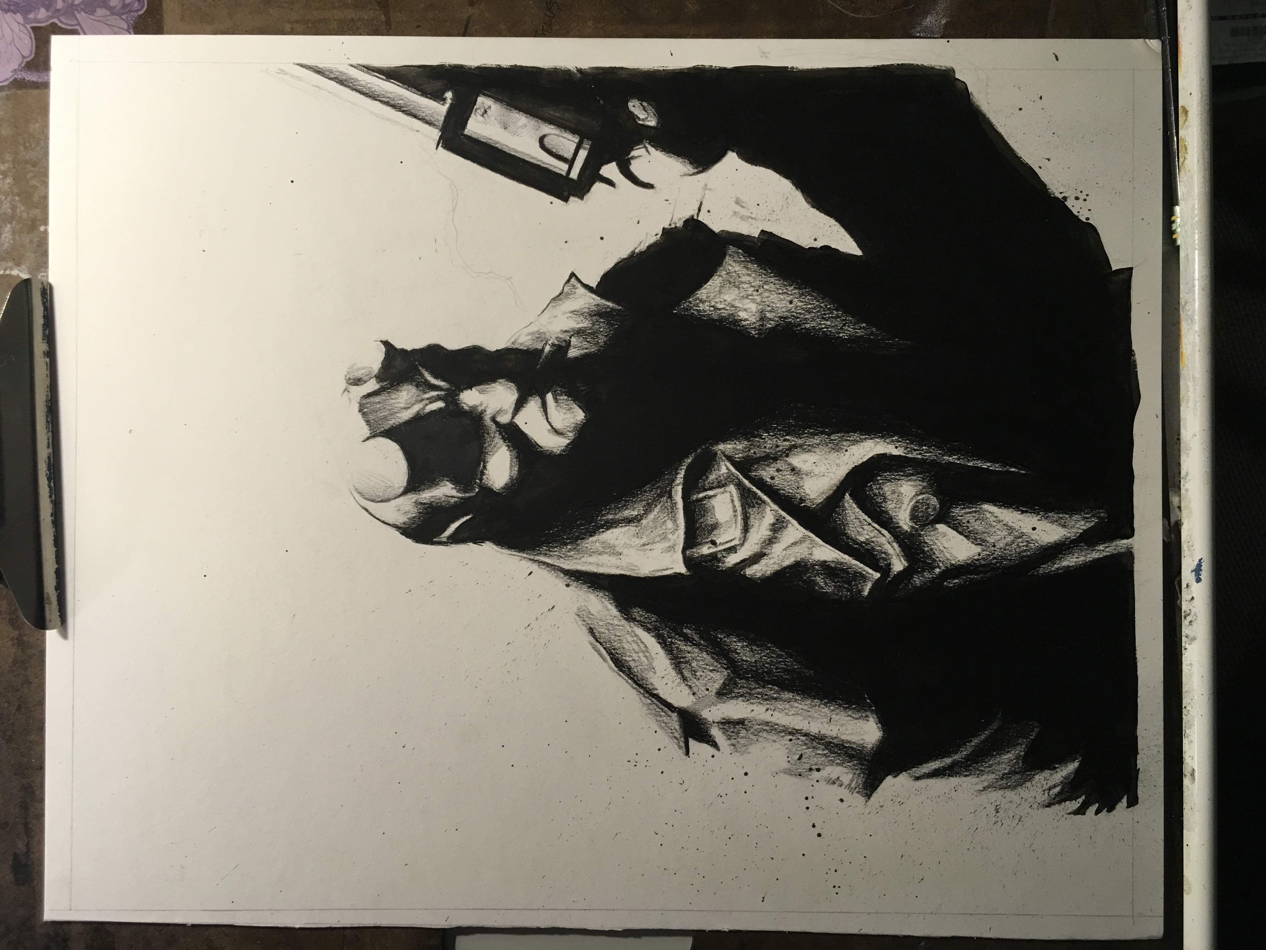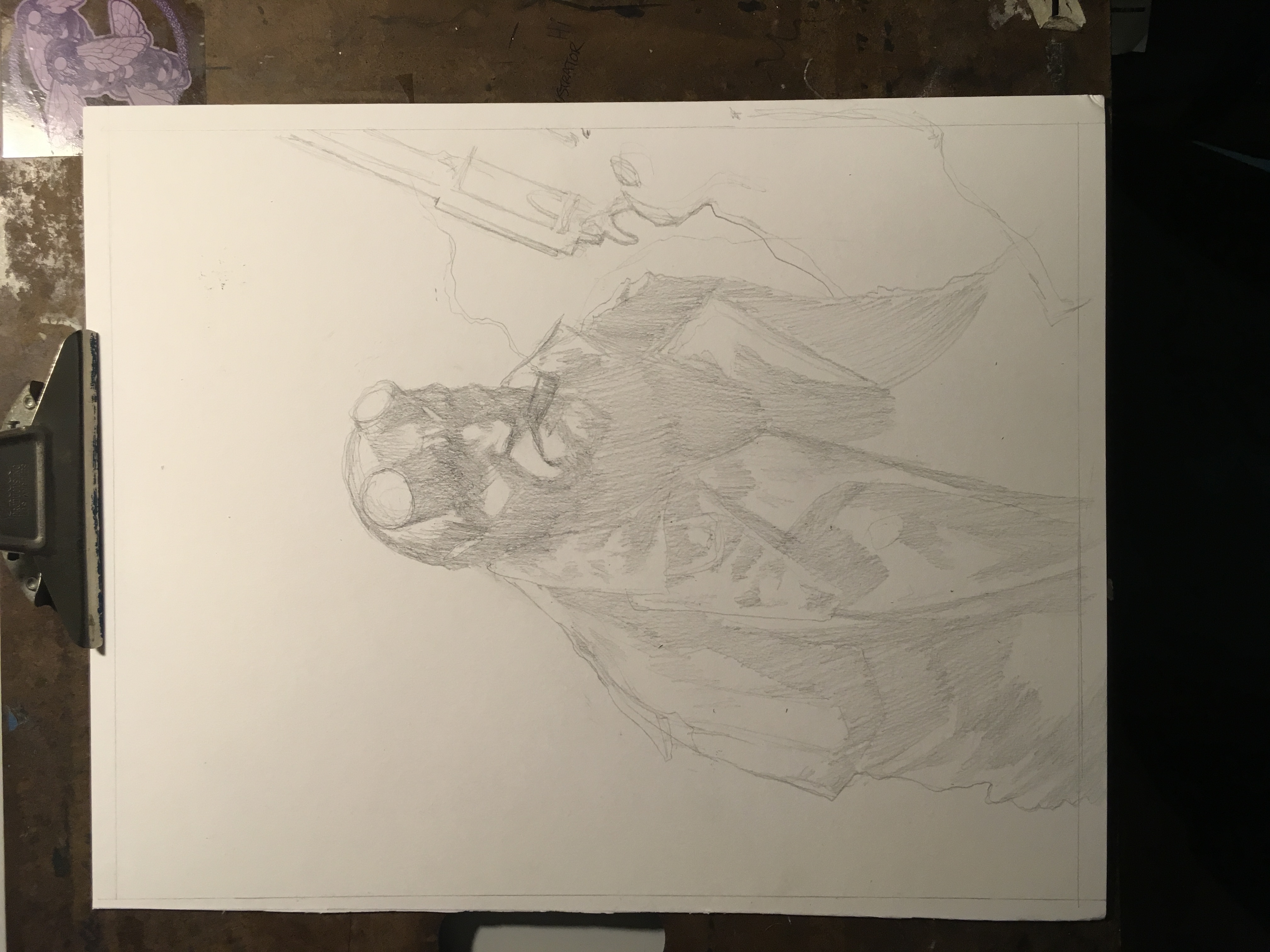 Step 01: Hashing out the drawing on the illustration board. I knew the client was a big fan of Del Toro Hellboy flicks, so I went primarily with that anatomy and costuming, but I wanted to include a nod to the comics as well. So from the get go I know I was going to go heavy on the blacks.