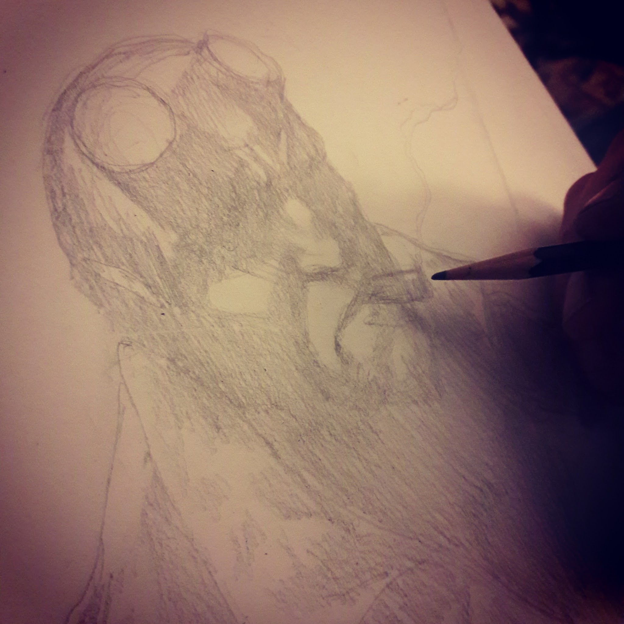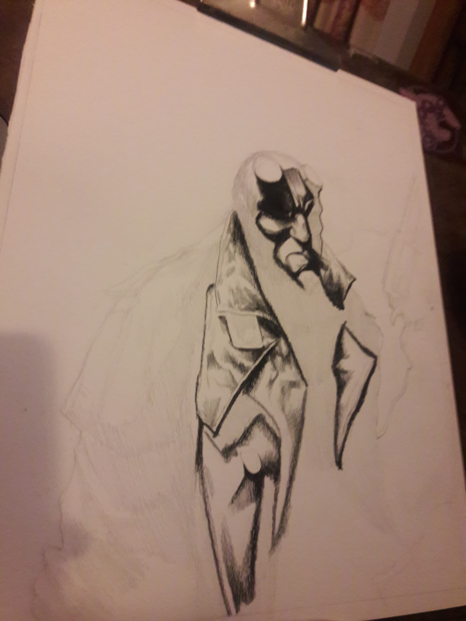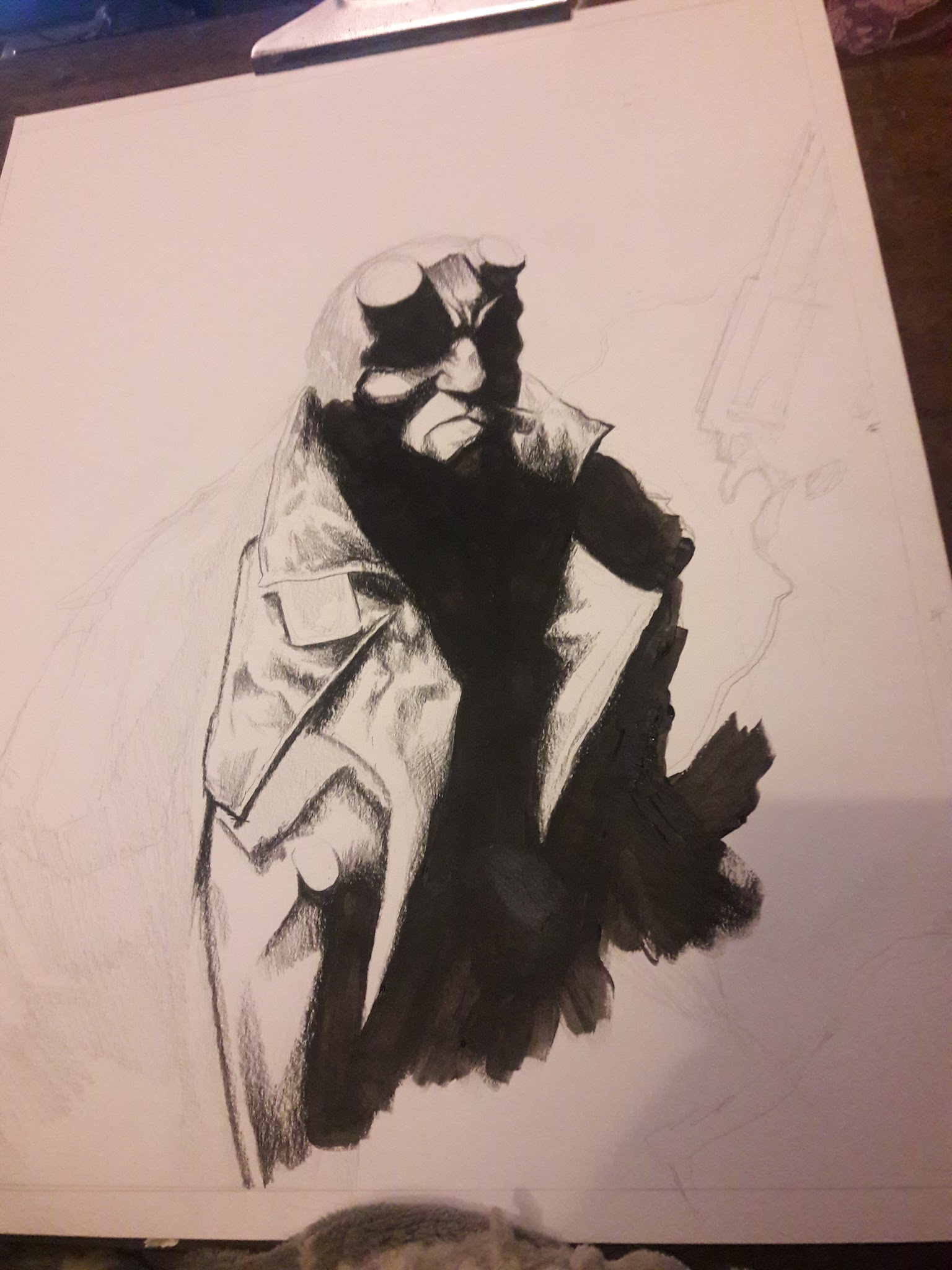 Hey y’all! Now that the conventions and events and such are over for the rest of the year (probably), i am diving back in to my commission list. Thought I’d share the process of this Hellboy piece. I do apologize as a few of the photos were taking with horrible phone.