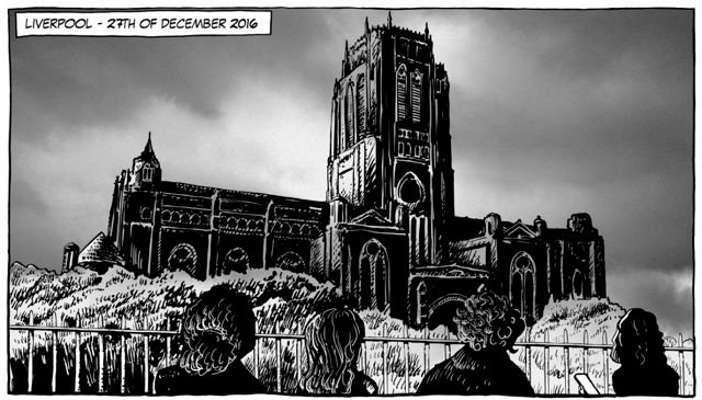 On peut dire beaucoup de choses sur la cathédrale anglicane de Liverpool, mais je vais juste dire ceci: elle a été construite entre 1904 et 1978 - tout à fait un anachronisme avec son architecture gothique. C'est aussi la plus grande église d'Angleterre et rien de moins que la cinquième plus grande cathédrale du monde. J'ai décidé que cela devrait faire partie de la bande dessinée lorsque j'ai vu cette magnifique aquarelle de 1910.