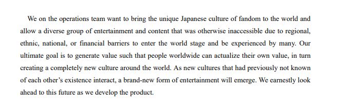 백서에 보면 이들은 파트너쉽도 차근 차근 준비하는것으로 보입니다. 물론 일본의 회사들이고, 이런 팬덤 문화에 있는 회사는 인디도많으니까 처음 부터 큰 곳과 하진 못하겟죠. 위의 백서 내용을 보면 알겟지만, 거의 전 팬덤 영역이 다 파트너쉽 대상입니다. 흥미롭습니다.