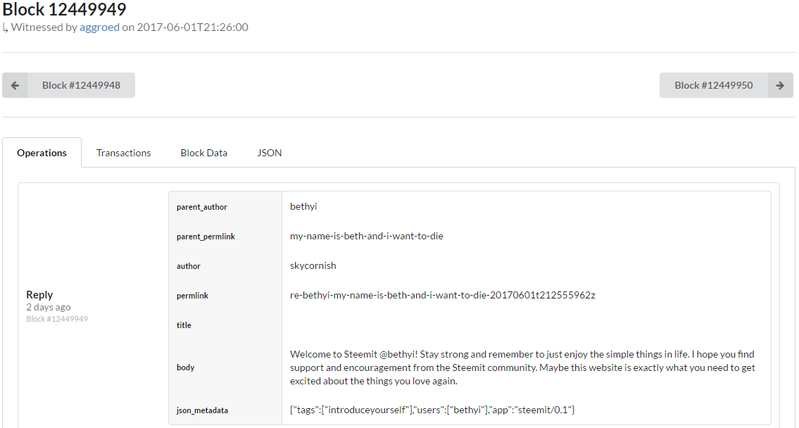 You'll notice it's a response to @bethyi 's first post- https://steemit.com/introduceyourself/@bethyi/my-name-is-beth-and-i-want-to-die