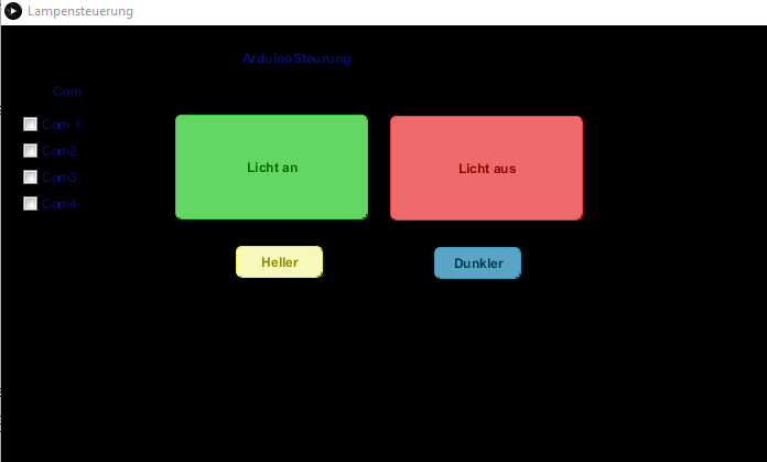 Auf der Processing Oberfläche muss man nun zunächst den Port des Arduinos wählen und dann kann man die LED an- und ausschalten, bzw. die Helligkeit der LED regeln.