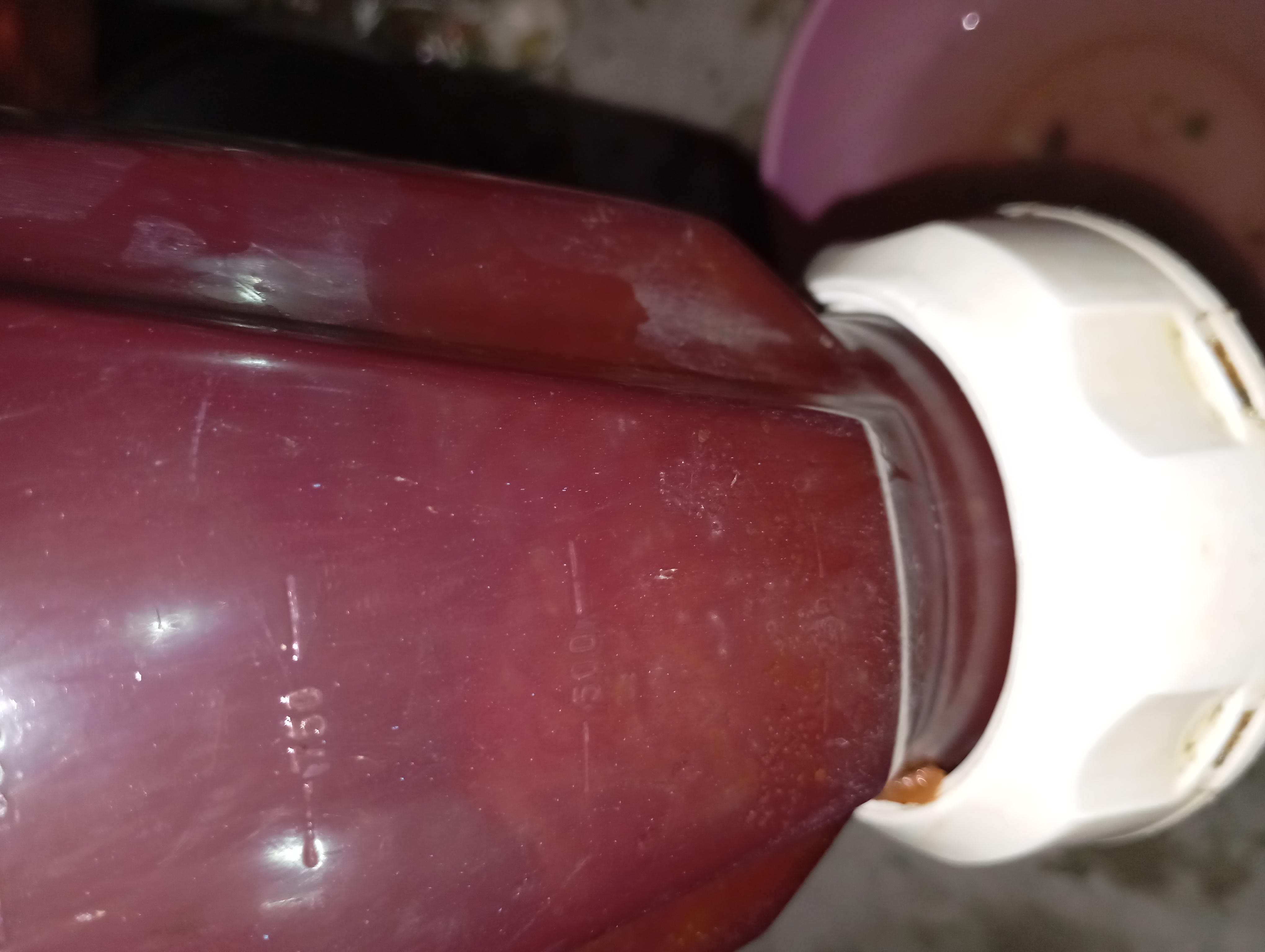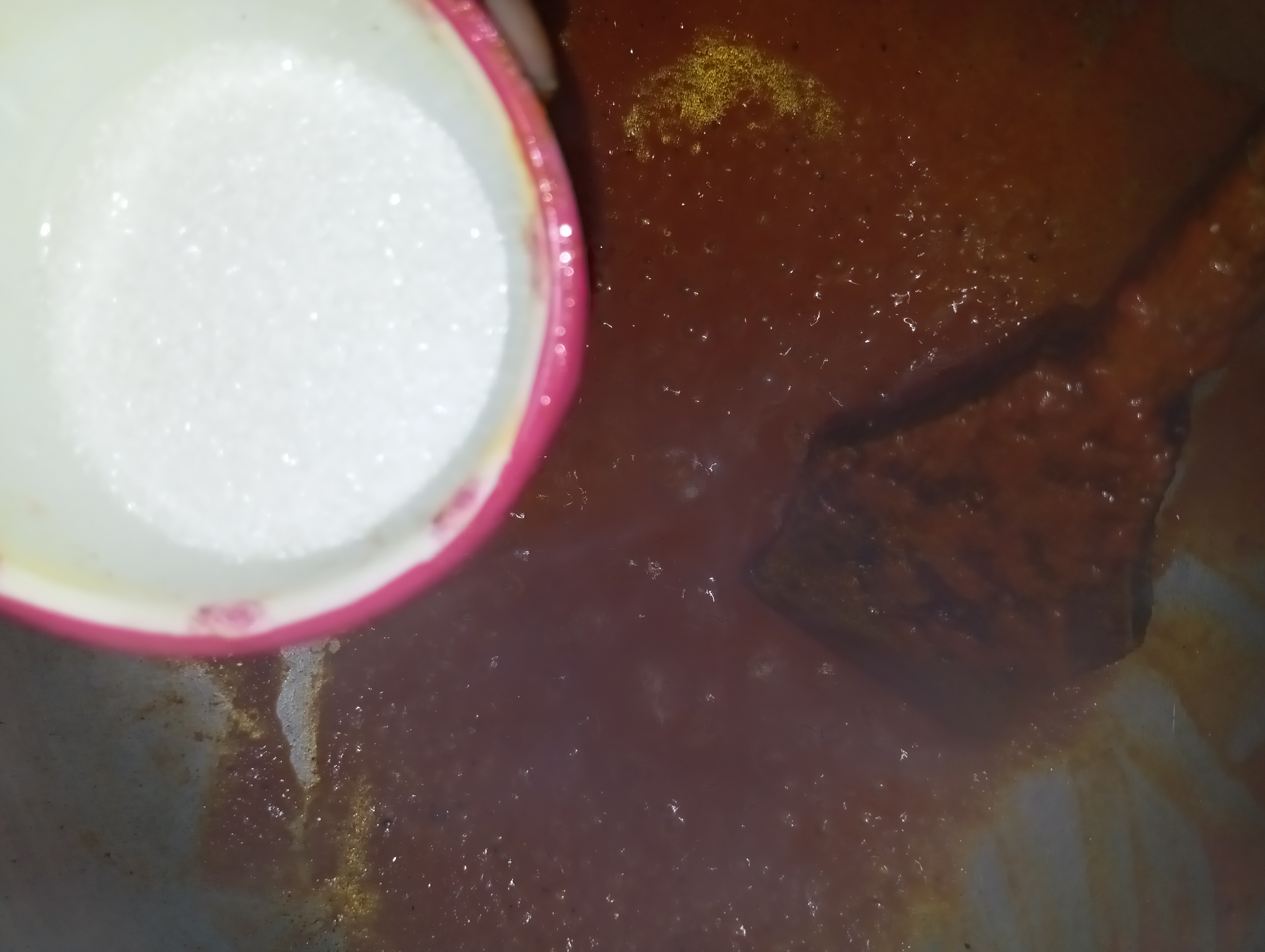 I poured the sifted tomato blend into the pot with the fricasseed flavors. At that point I included apple cider vinegar, salt, and sugar, and blended continuously.