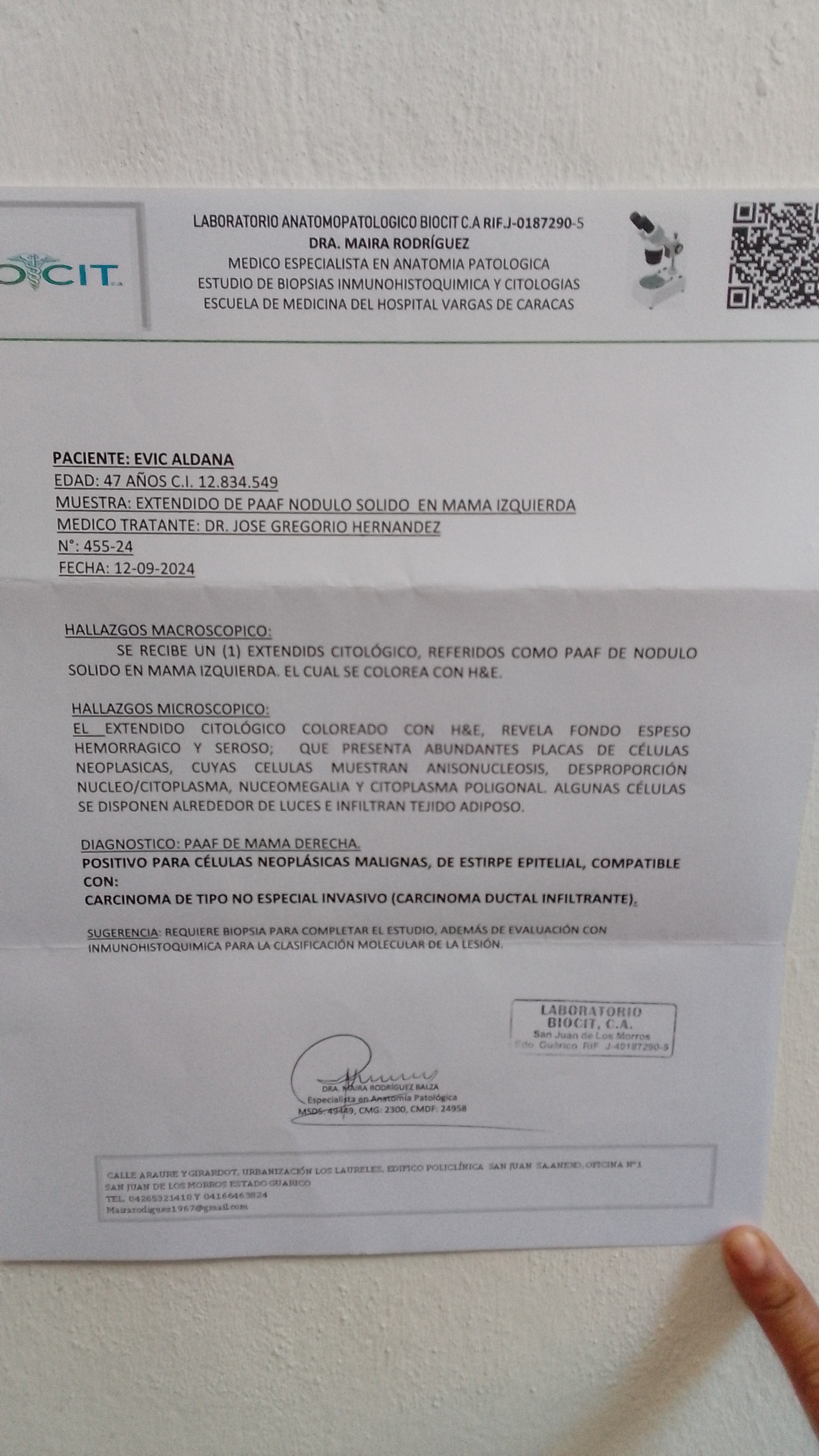 El viernes tocó buscar los resultados de la biopsia y mi familia y amigos me acompañaron para recibir la dura noticia de que la biopsia dio positivo para células neoplásicas malignas compatible con: carcinoma de tipo no especial invasivo. Fue un fuerte golpe recibir está noticia. Pero el Dr nos explico que a penas está comenzando y que estamos a tiempo ya que está muy pequeño.