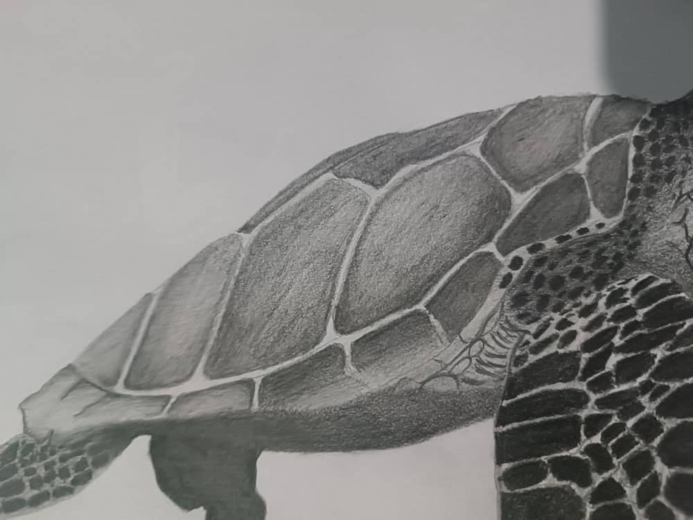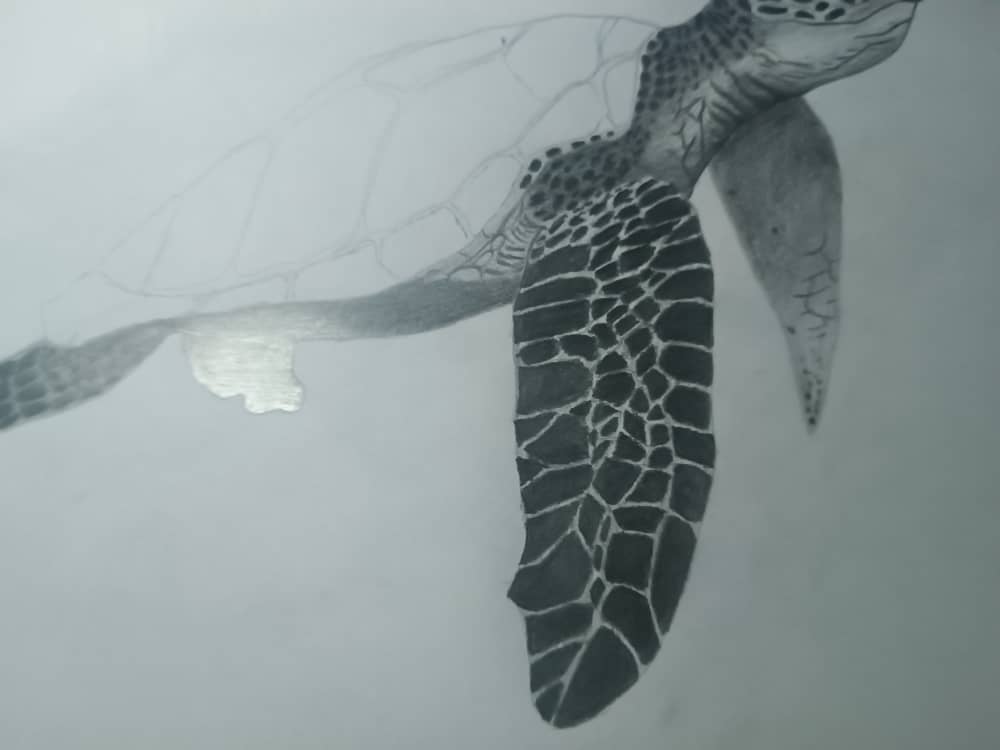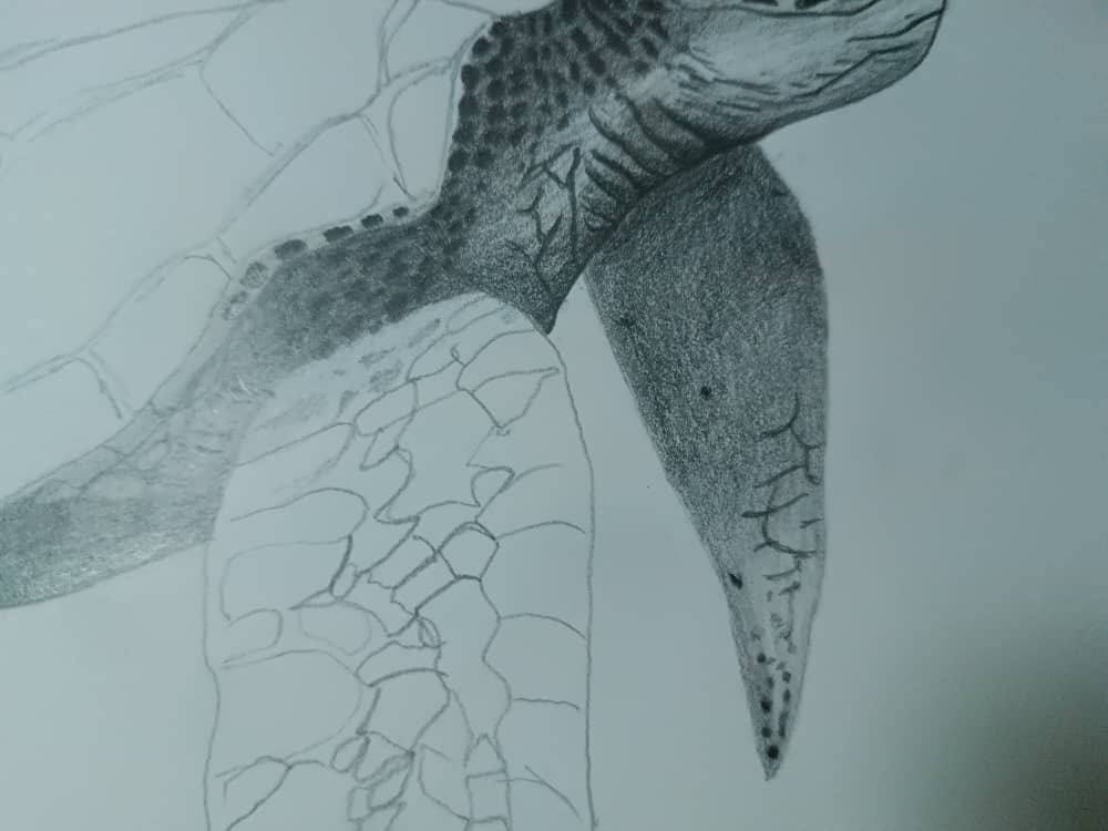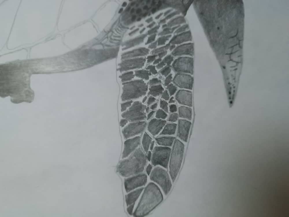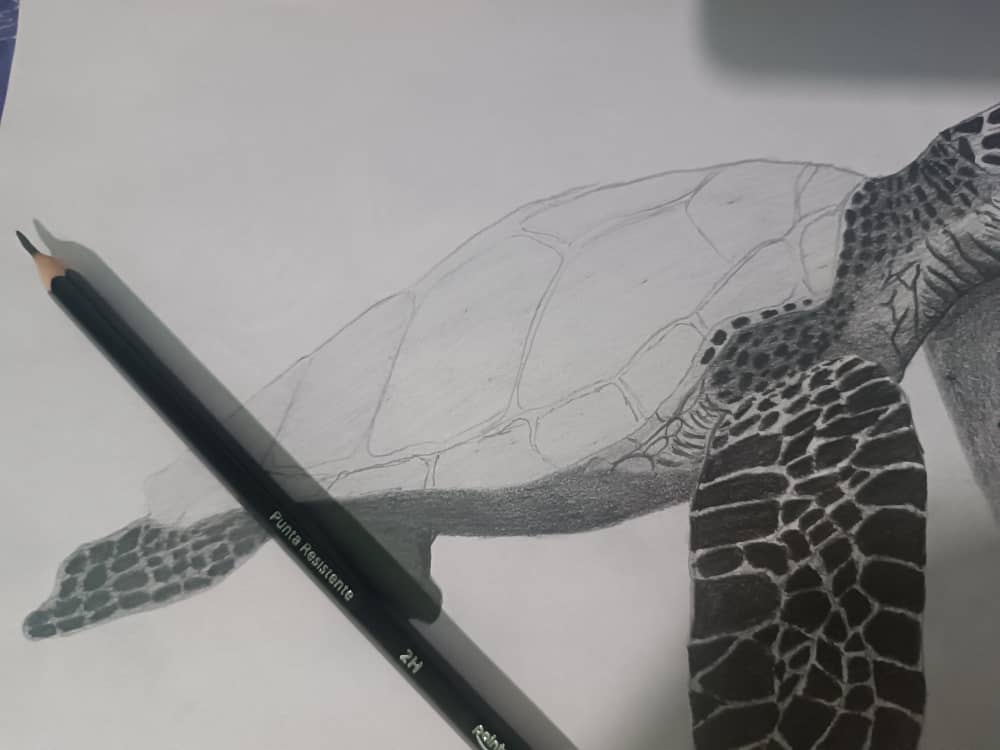 Me puse a hacer los detalles generales del dibujo, los ojos, cada detalle en las aletas y su caparazón, para este tipo de cosas recomiendo utilizar el lápiz H o HB ya que dan el balance perfecto.