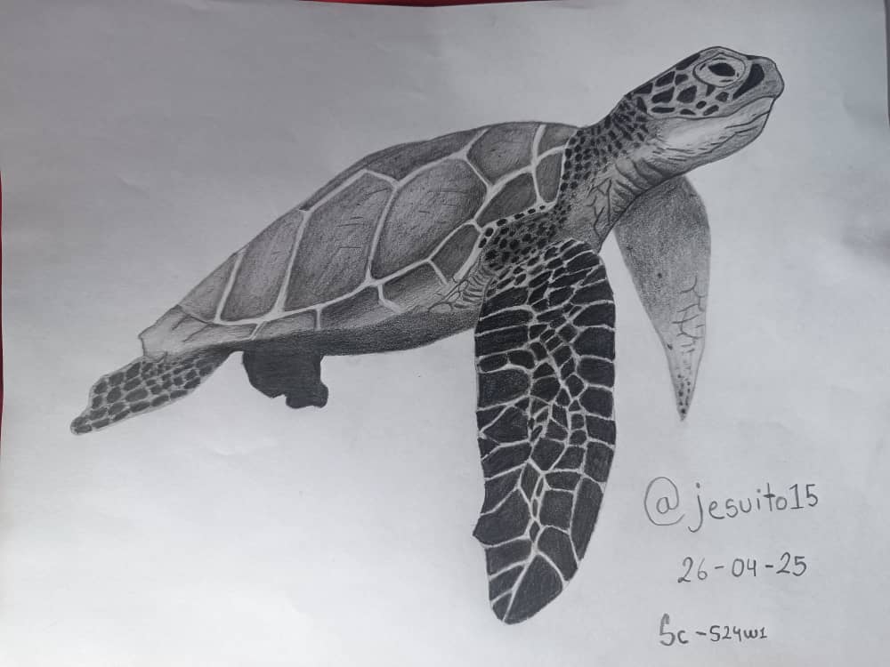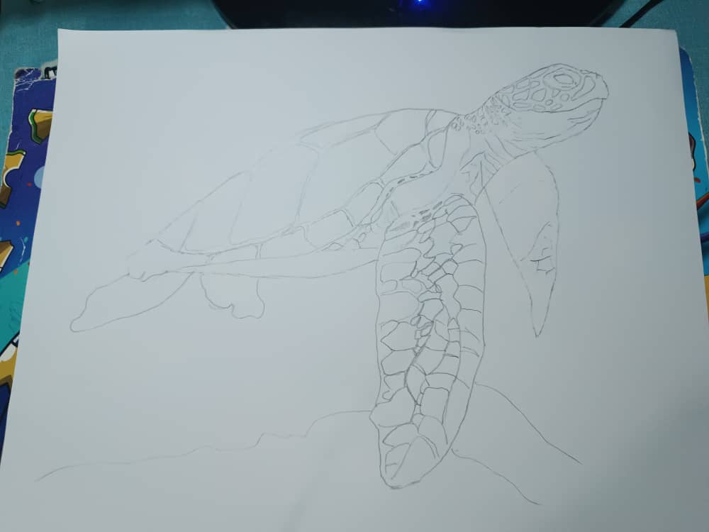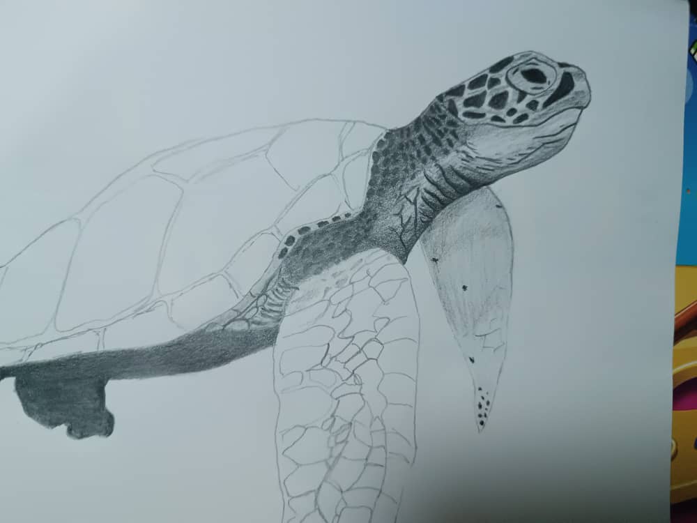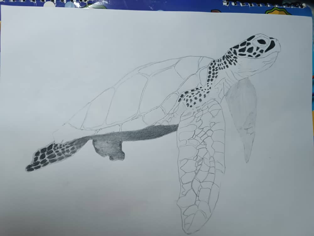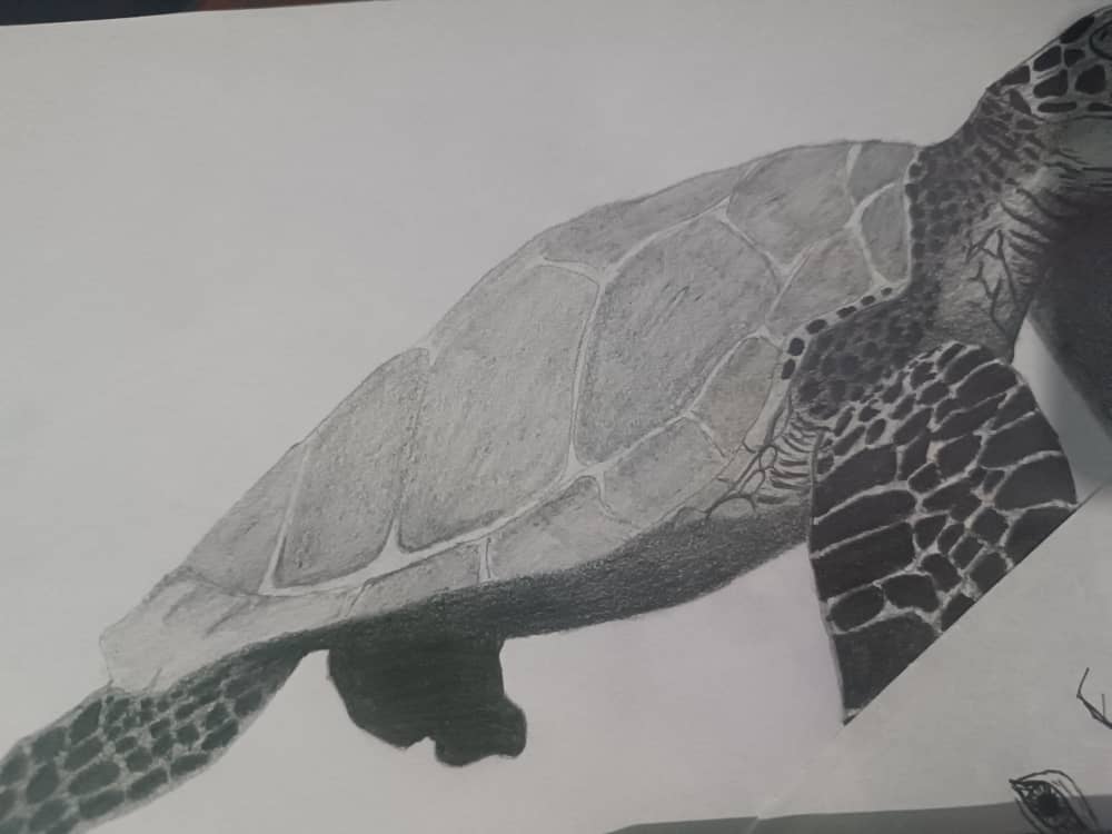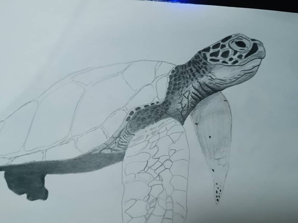 Me puse a hacer los detalles generales del dibujo, los ojos, cada detalle en las aletas y su caparazón, para este tipo de cosas recomiendo utilizar el lápiz H o HB ya que dan el balance perfecto.