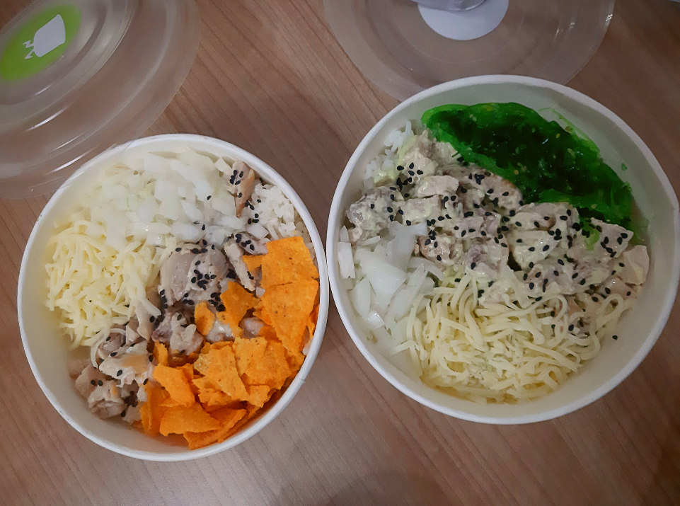 En cuanto a las salsas, mi pareja le pone Sriracha picante pero en poca cantidad, yo le pongo aceite de oliva y de aguacate, en cuanto a los toppings ambos le ponemos queso mozarella y cebolla dulce, pero para el ultimo topping escogemos diferentes opciones, ella le pone Doritos y yo un alga llamada Wakame.
