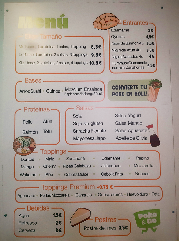 Desde hace un buen tiempo atrás había oído sobre el Poke, pero no fue hasta ahora que tuve la oportunidad de probarlo y fue en este lugar, al llegar te encontraras con su menú en grande a un lado de la entrada para que puedas ir preparándote para hacer tu pedido.