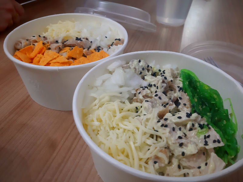 Como pueden observar, la cantidad de proteína, salsas y toppings varia según el tamaño del Poke, en nuestro caso nos pedimos dos de tamaño L, ambos con arroz como base y pollo como proteína.