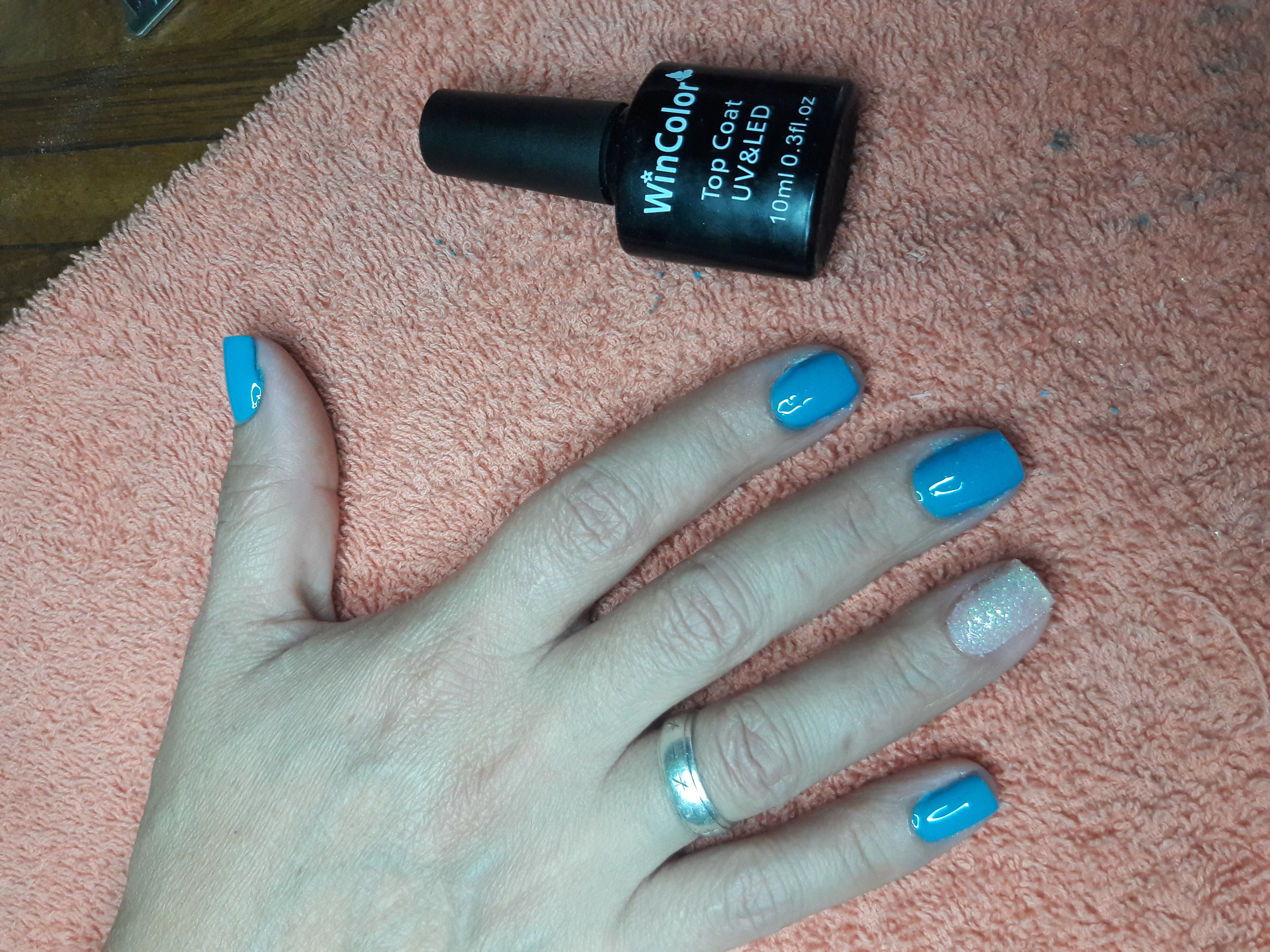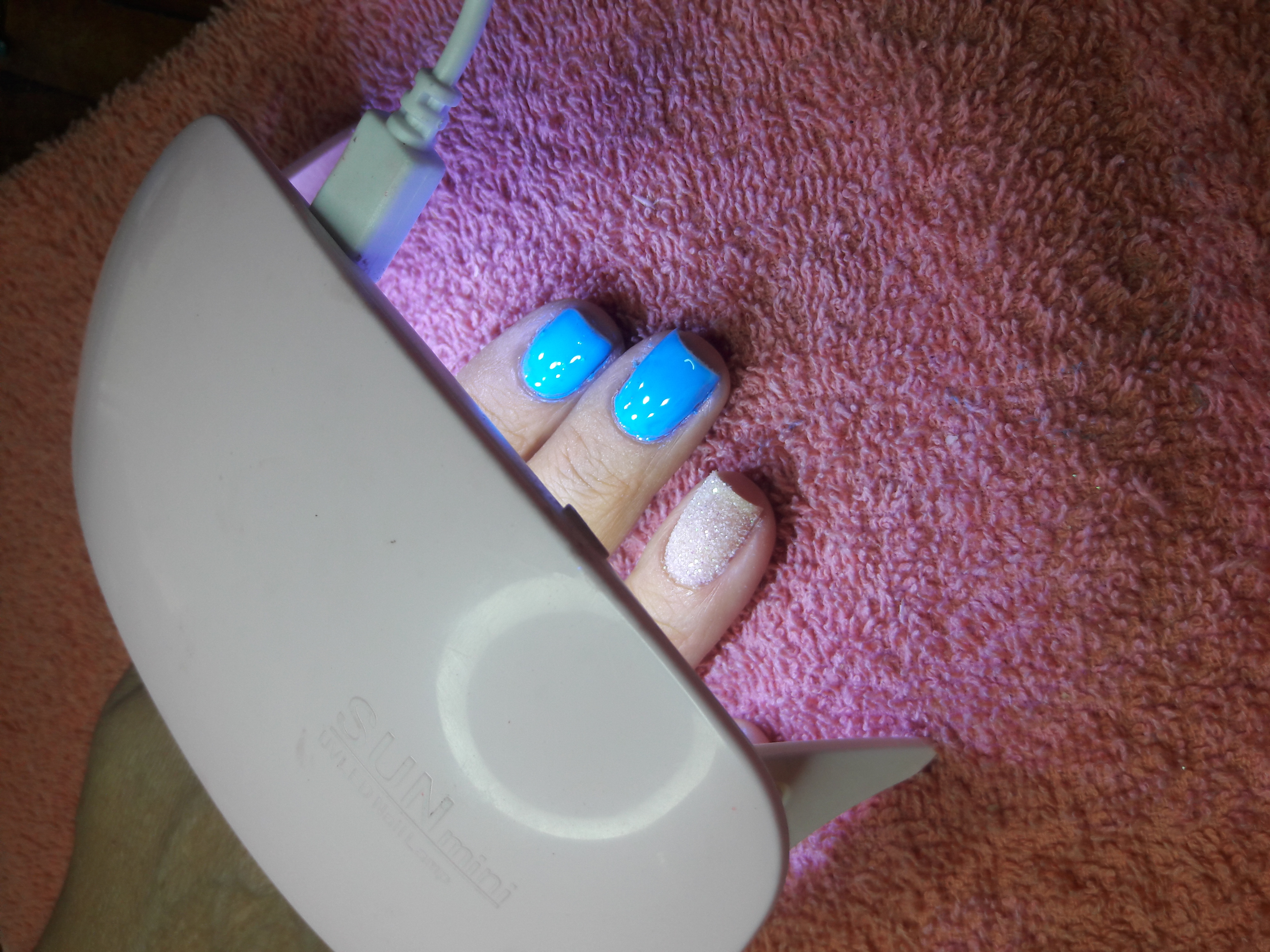 •llega el momento del color. Utiliza un esmalte para manicura semipermanente con base en gel, les recomiendo aplicar dos capas. Aplica una capa de color y pon la mano bajo la lámpara LED UV 2 minutos, después aplica una segunda capa y deja secar nuevamente bajo la lámpara otros 2 minutos.