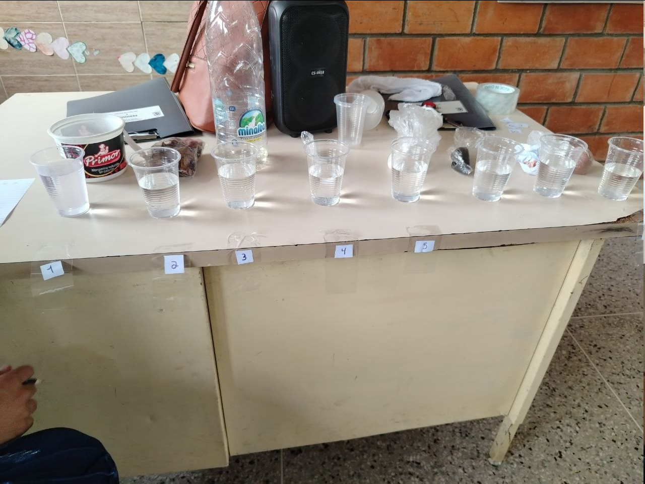 Mi idea con el experimento era ver la percepción y la capacidad de análisis de los alumnos, se le habló un poco de los términos y que en el experimento se debía observar bien y tener los sentidos bien agudos para realizar un buen análisis ya que todos podemos tener diferentes puntos de vistas y percepción de las cosas que pasan. Asigne diferentes elementos o sustancias para mezclar por ejemplo: champú, azúcar, tierra roja y negra, desinfectante y demás, todos combinados hacen que el agua cambie su estado original y cada uno sirve para una cosa o no.