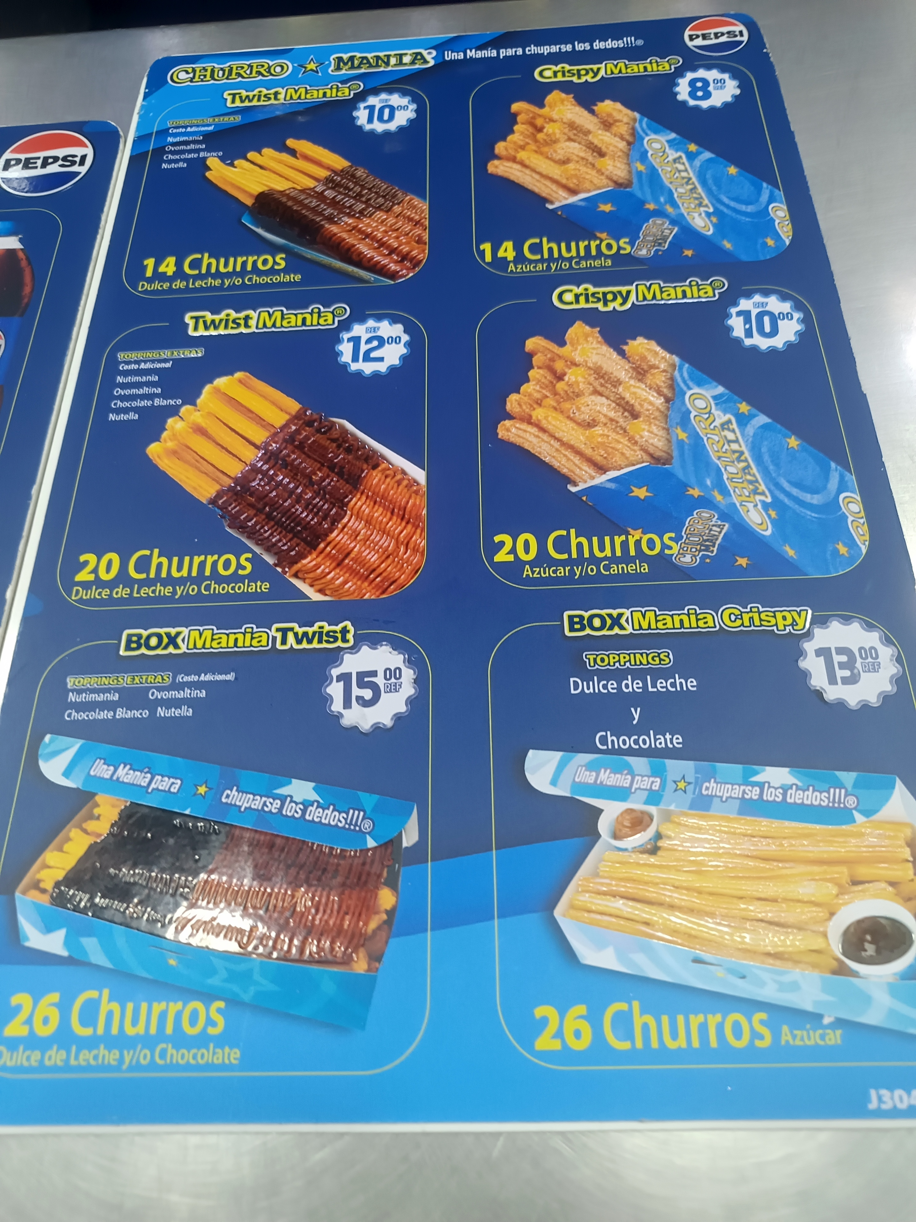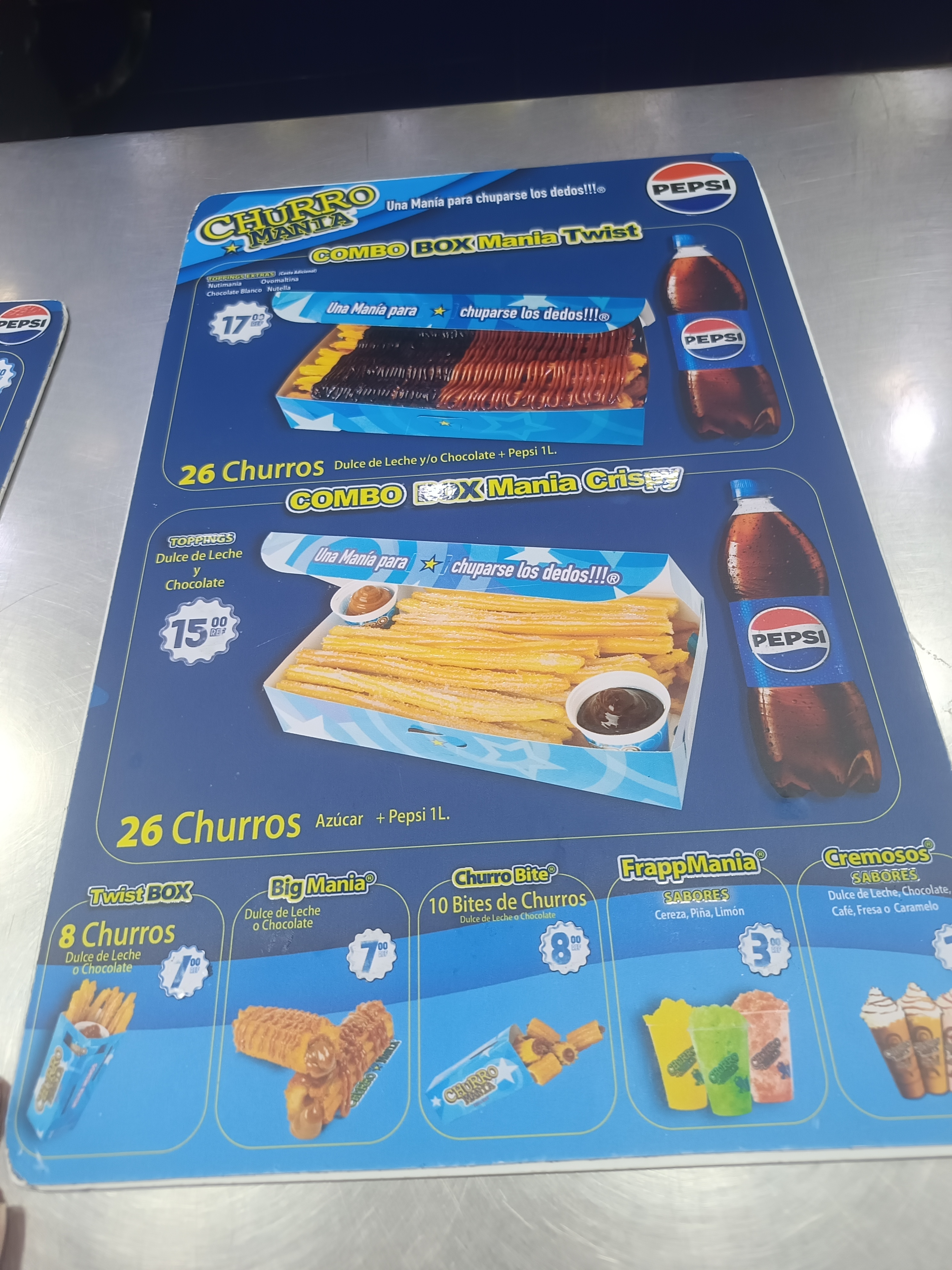 Su menú es muy variado porque además de churros tienen Frappé, Café fríos y calientes, chocolate caliente, sundae, refresco, agua, Nestea, y los más pedidos los cremocitos fríos.