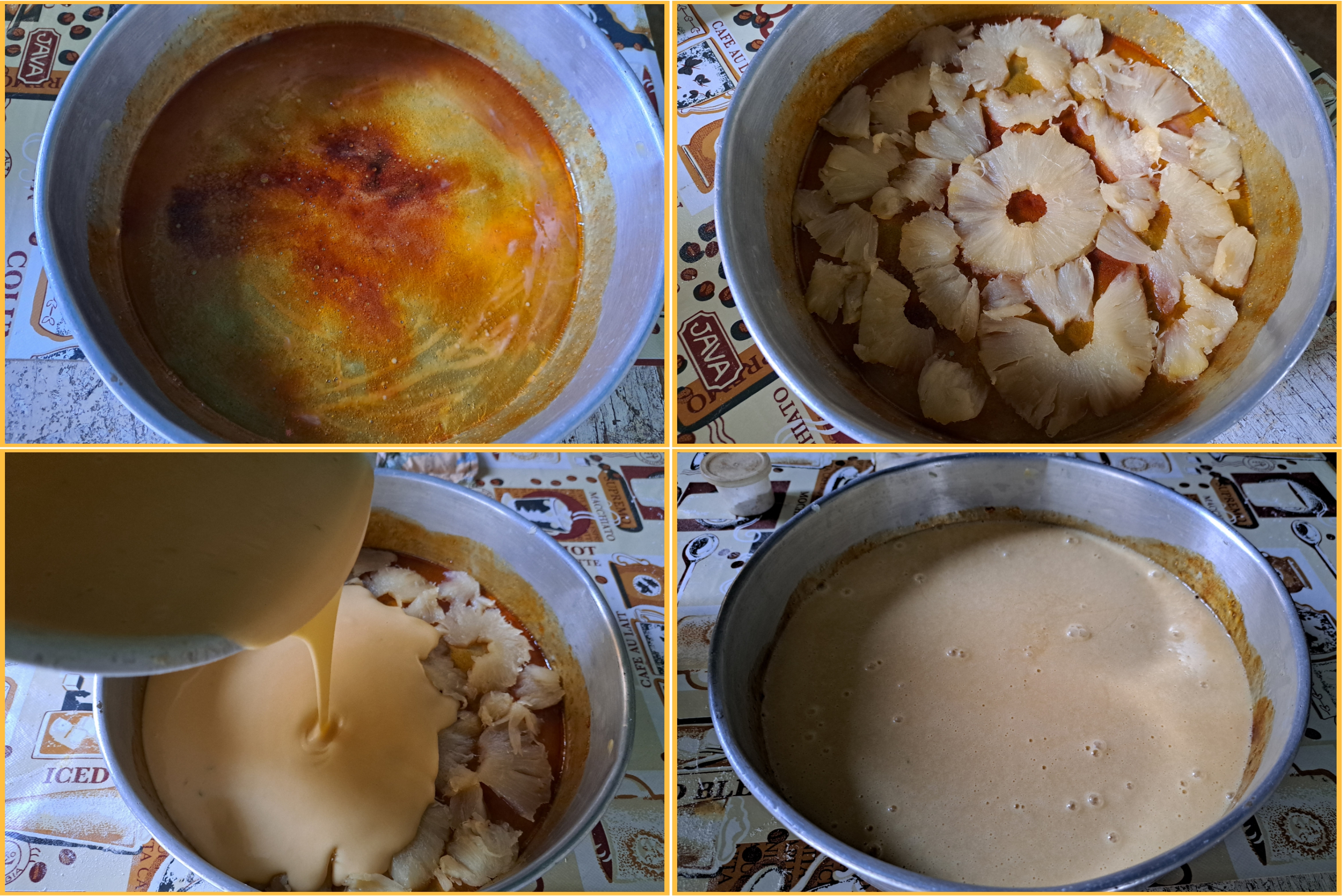 Aparte preparamos un Caramelo en la bandeja que utilizaremos para hacer la torta y hervimos un poco las piñas y luego las colamos, embadurnamos la bandeja con margarina antes de colocar las piñas y finalmente agregamos la mezcla.