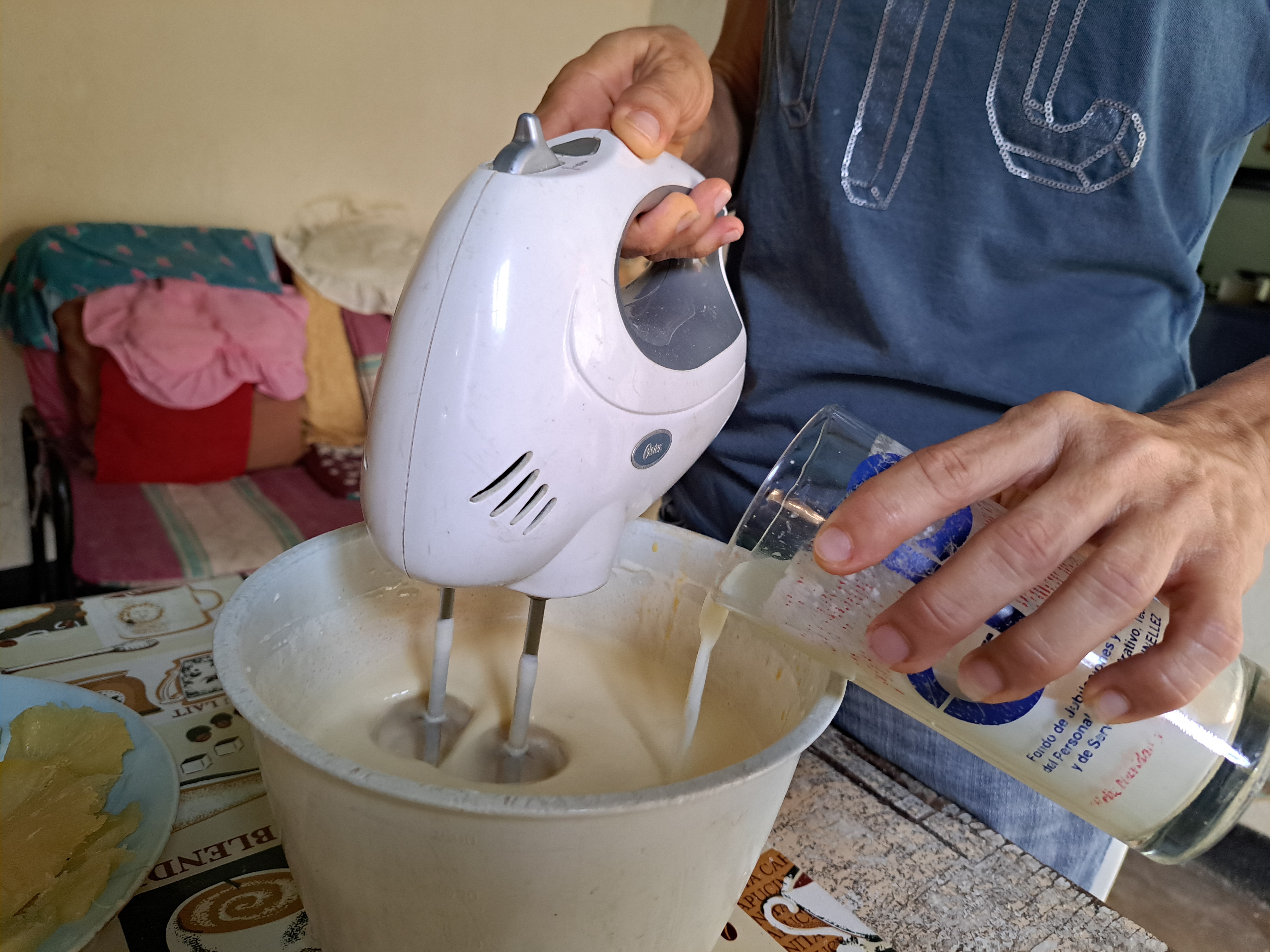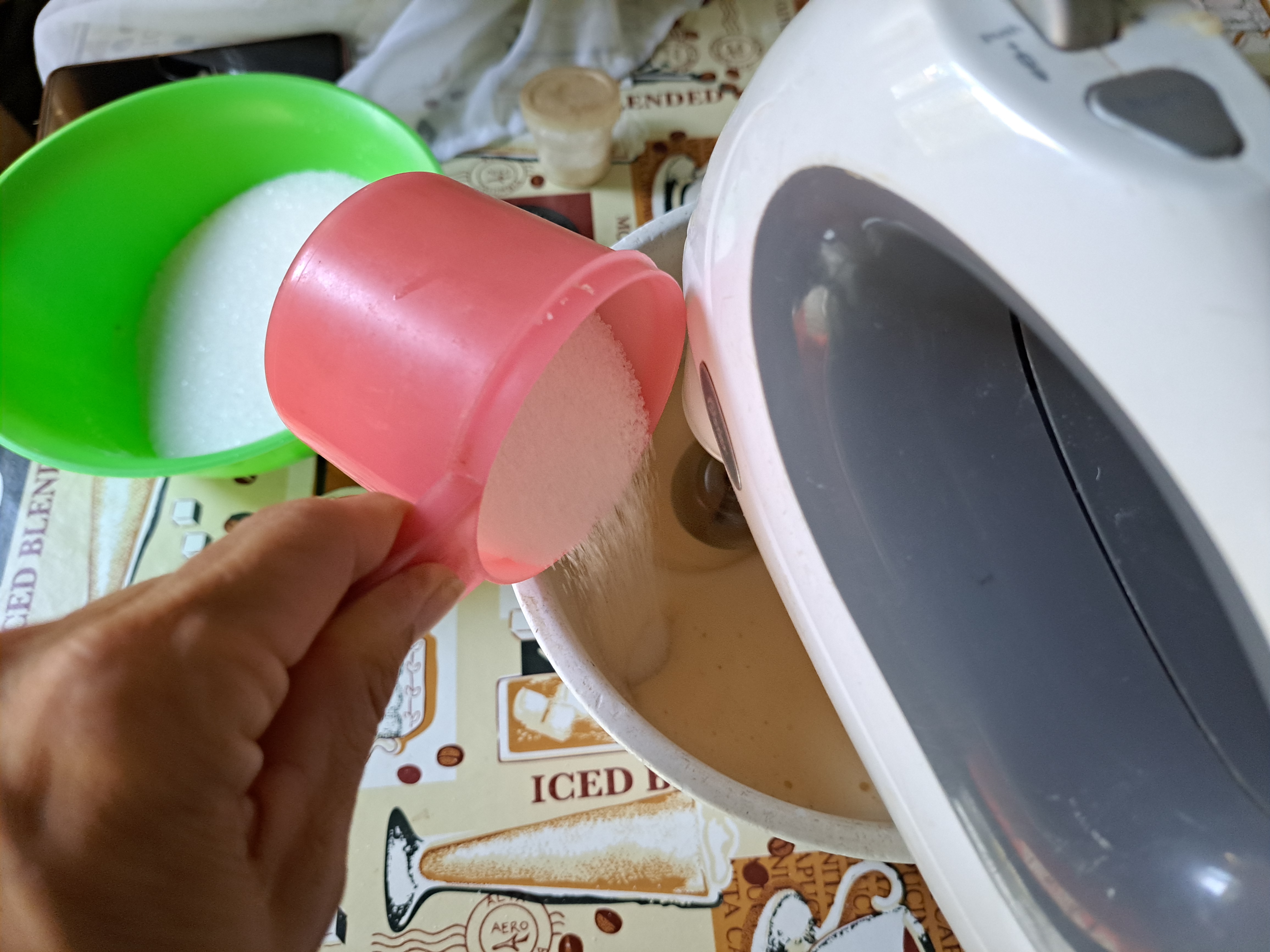 Pasados los 8 minutos le empiezo agregar la azúcar poco a poco y se sigue batiendo unos 5 minutos más.