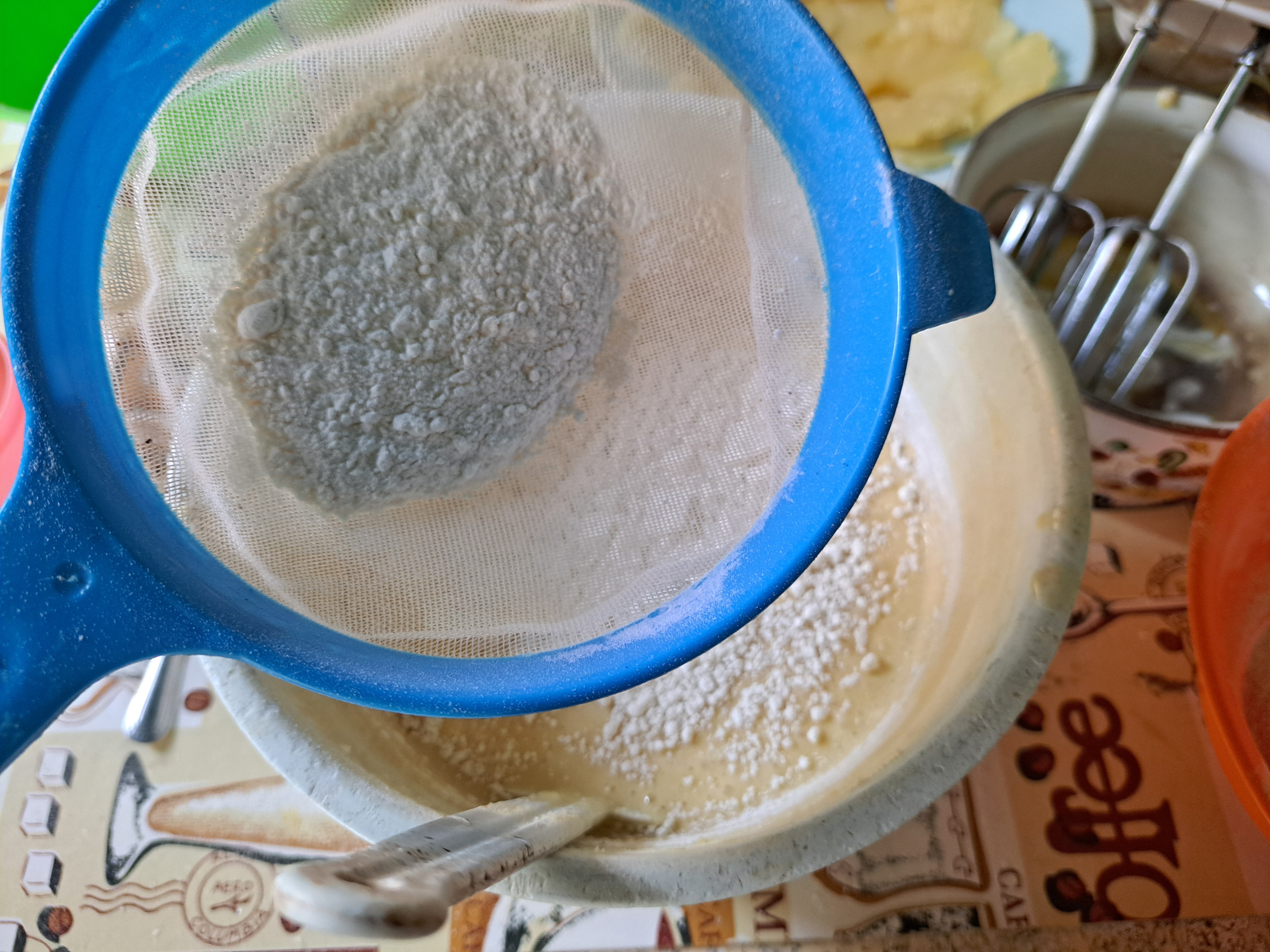 Como pudieron ver primero utilizamos todos los ingredientes liquidos, ahora vamos con los sólidos, asi que pasamos la harina por un colador y se la empezamos a agregar ya no con batidora sino con una paleta manual de forma envolvente junto con el biscarbonato.
