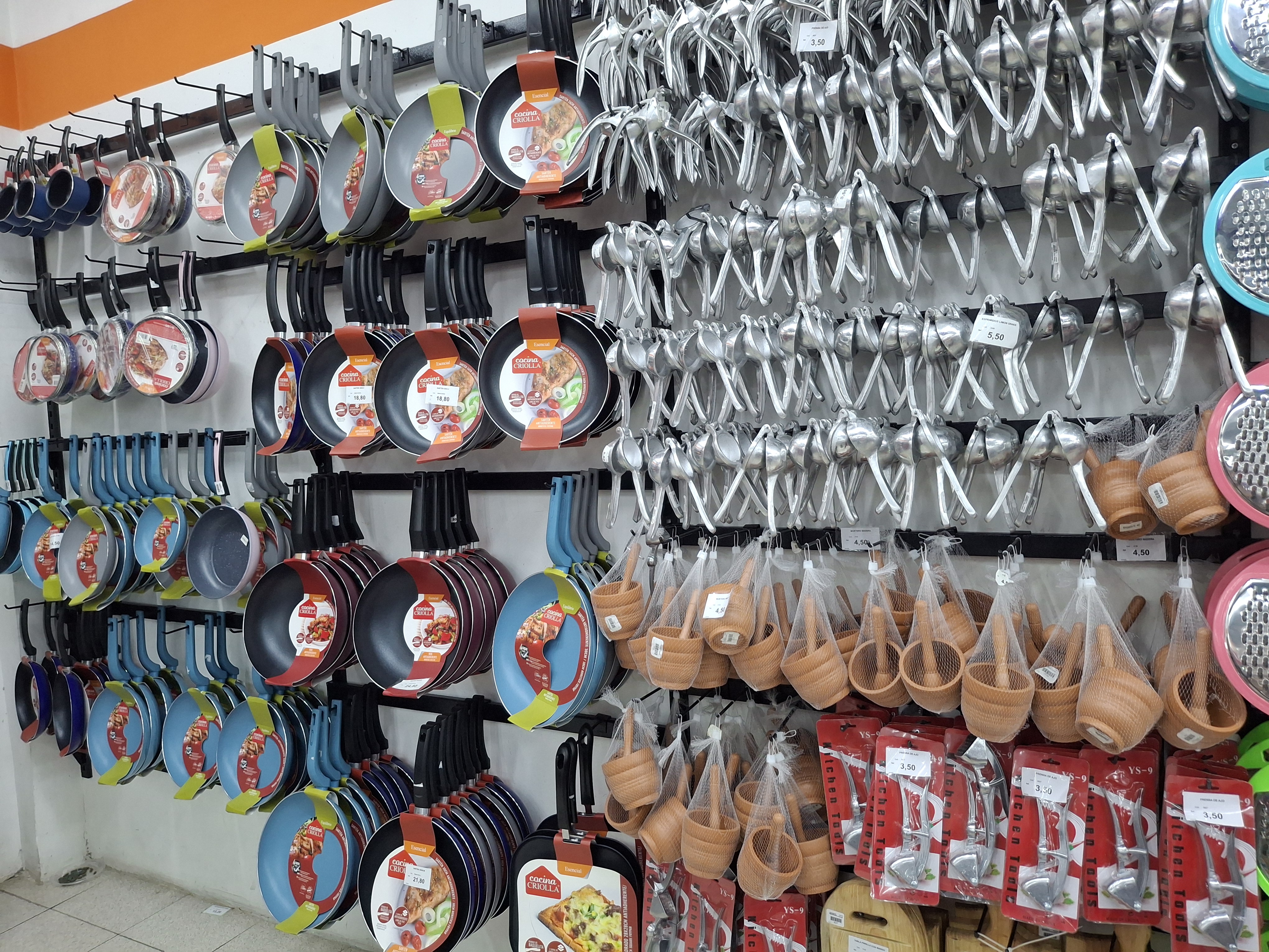 Pude ver qué aquí encuentras sartenes, ollas, coladores, rallador, parrillas, cucharones, paños de cocina, cepillo, palas, haraganes, jaboneras y otros implementos que son muy útiles para el hogar, aparte venden colas, cintillos, gorras, sombreros, viceras, carritos de compras, juguetes como carritos, peluches, muñecas, carpas para niños, hay un área de solo mascotas donde venden juguetes, alimentos y productos para su cuidado como champú, entre otros.