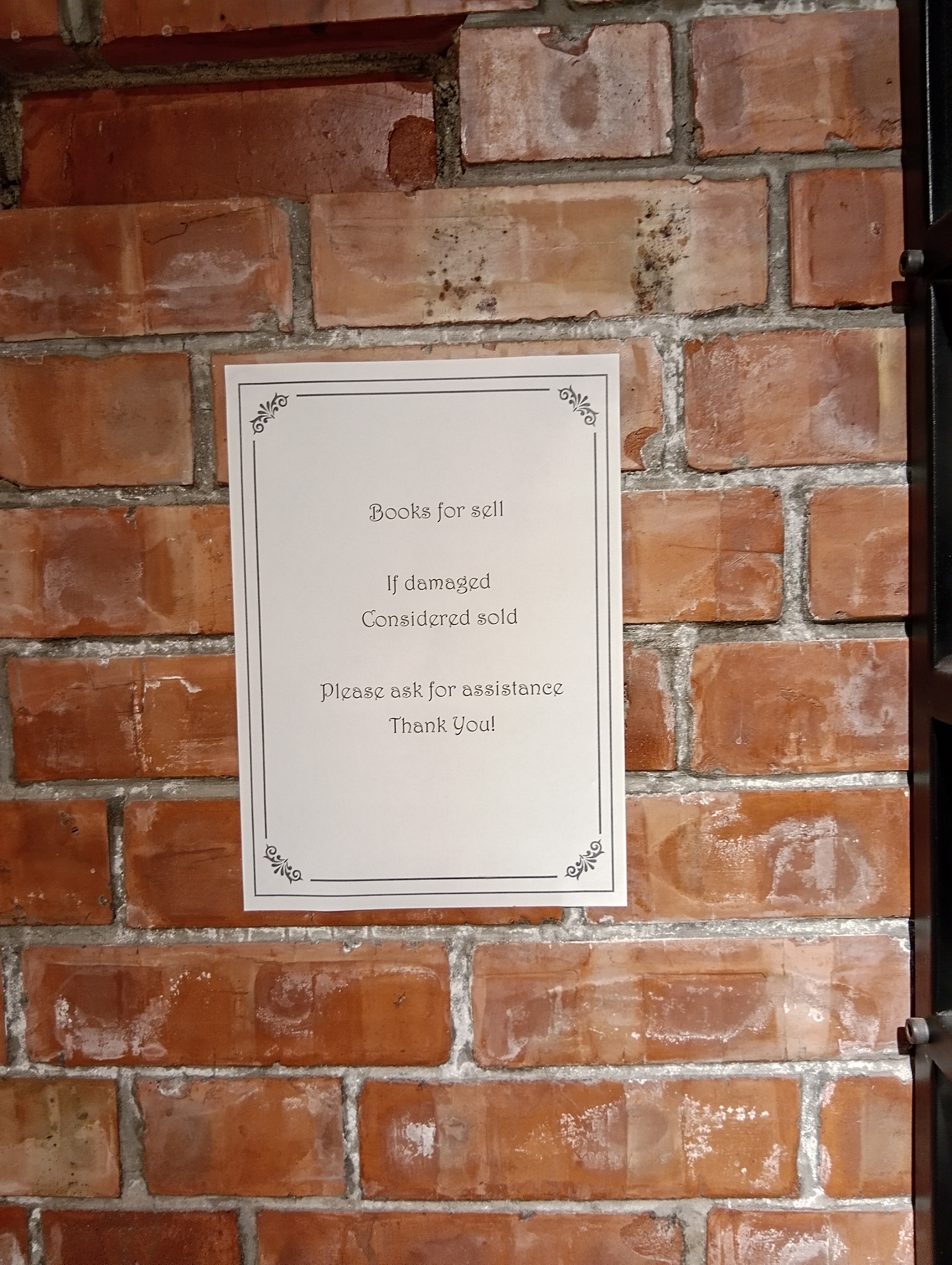 | This image displays a sign on a brick wall informing customers about a book sale. Books are available for sale, Damaged books are considered sold, customers should ask for assistance |