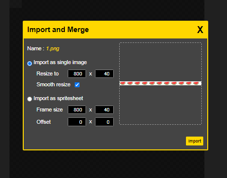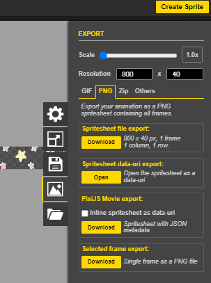 ‣ Al tenerlo listo descargamos en la sección de lado izquierdo nuevamente, en PNG, "download" "spritesheet file export" y se guardara en nuestros archivos.