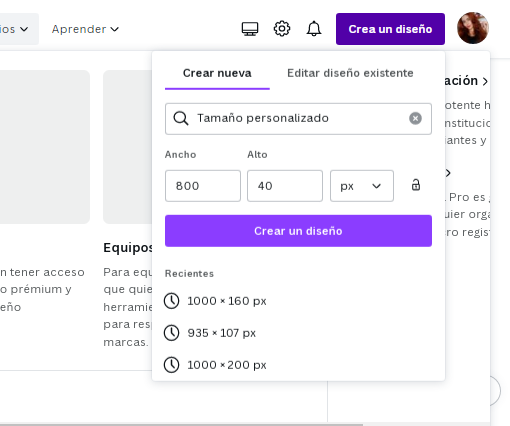 ‣ Las medidas personalizadas a usar es 800x40px, configuramos e iniciamos a diseñar.
