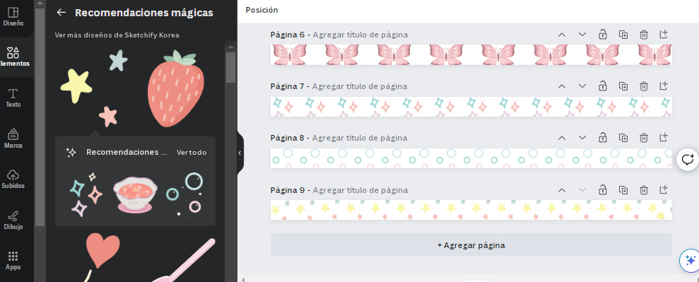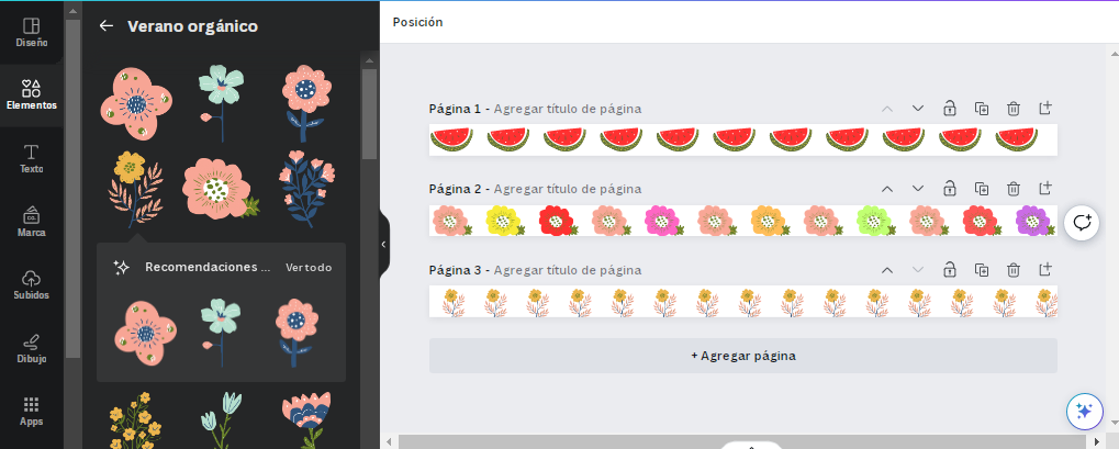 ‣ En el lado izquierdo en la sección "elementos" puedes buscar el elemento gráfico de tu elección, en mi caso me decidí por sandía, flores, burbujas, y entre otras cositas que me parecieron adorables.