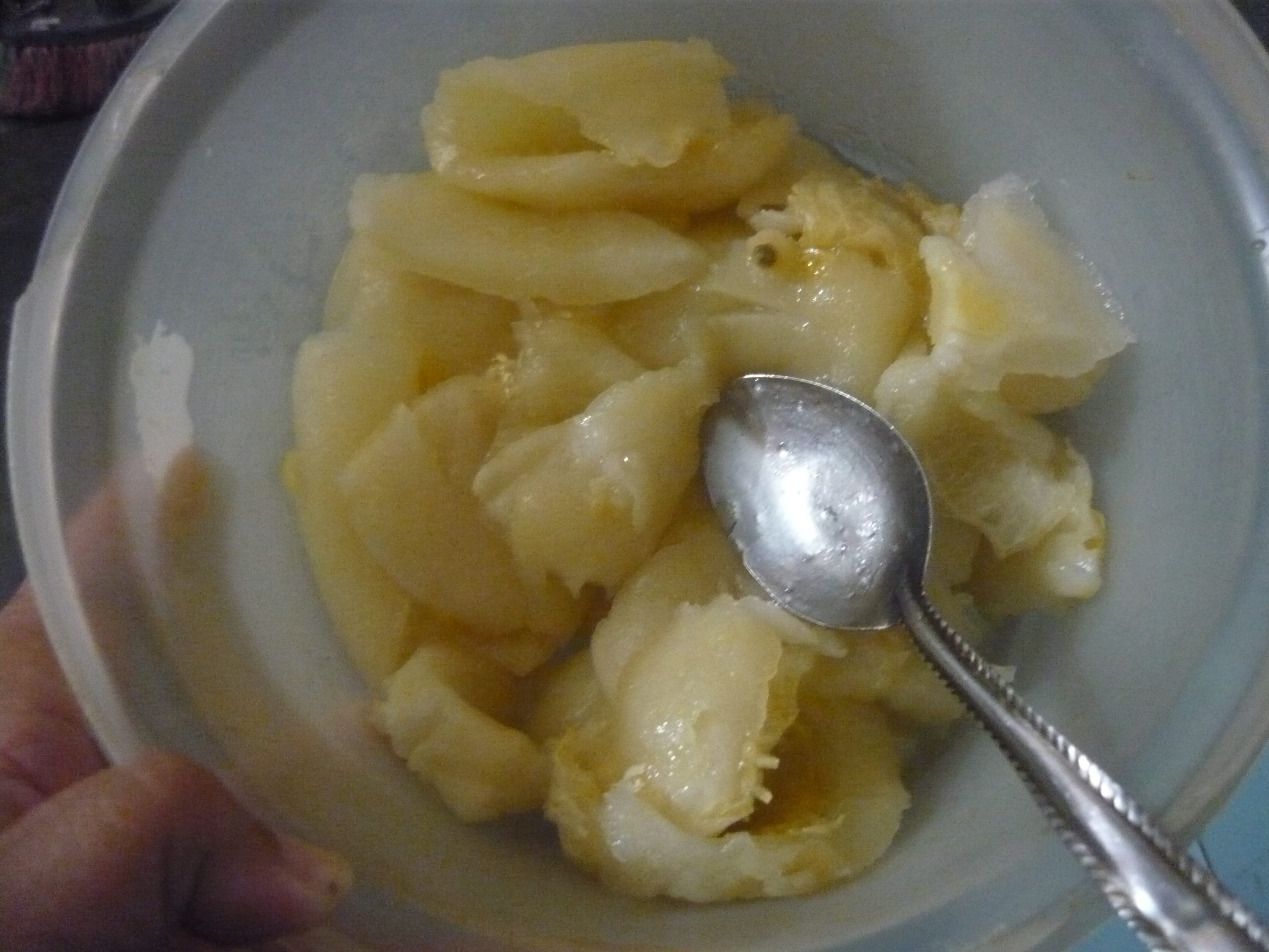 2.- Luego cuando las cascaras esten frias, sacar con una cuchara la parte blanda, lo demas se bota la fina piel de la cascara.