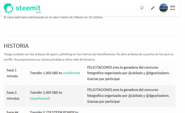 se anexa screen capture del pago de directo de SBD a cada ganador