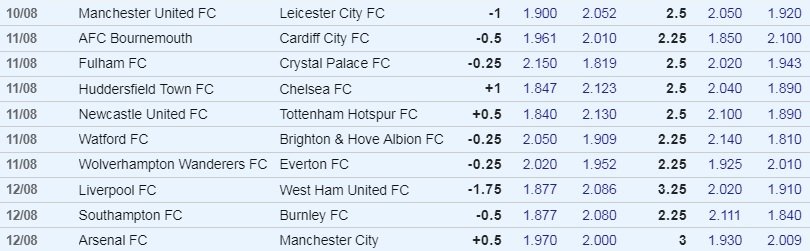 All 40 Betting options. Home Team Away Team Over Goals Under Goals Man United Leicester Man United Over Man United Under Bournemouth Cardiff Bournemouth Over Bournemouth Under Fulham Crystal Palace Fulham Over Fulham Under Huddersfield Chelsea Huddersfield Over Huddersfield Under Newcastle Tottenham Newcastle Over Newcastle Under Watford B&H Albion Watford Over Watford Under Wolverhampton Everton Wolverhampton Over Wolverhampton Under Liverpool West Ham Liverpool Over Liverpool Under Southampton Burnley Southampton Southampton Arsenal Man City Arsenal Over Arsenal Under