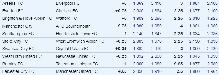 Home Team Away Team Over Goals Under Goals Arsenal +0 Liverpool +0 Arsenal Over 3 Arsenal Under 3 Everton +0.75 Chelsea -0.75 Everton Over 2.25 Everton Under 2.25 B&H Albion +0 Watford +0 B&H Albion Over 2.25 B&H Albion Under 2.25 Man City -2.75 Bournemouth +2.75 Man City Over 4 Man City Under 4 Southampton -1 Huddersfield +1 Southampton Over 2.25 Southampton Under 2.25 Stoke -0.25 WBA +0.25 Stoke Over 2.25 Stoke Under 2.25 Swansea +0.25 Crystal Palace -0.25 Swansea Over 2 Swansea Under 2 West Ham -0.25 Newcastle +0.25 West Ham Over 2.25 West Ham Under 2.25 Burnley +1 Tottenham -1 Burnley Over 2.25 Burnley Under 2.25 Leicester +0.5 Man United -0.5 Leicester Over 2.5 Leicester Under 2.5