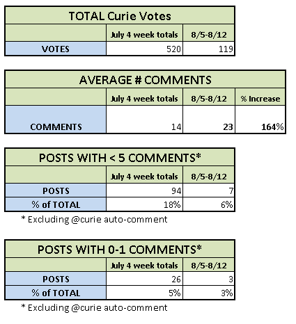 The goal of this contest is to drive engagement toward the awesome authors curated by Curie every week. Compared with the prior 4 week period in July, we saw over an 150% increase in comments left on posts upvoted by Curie! And we are just getting started :)