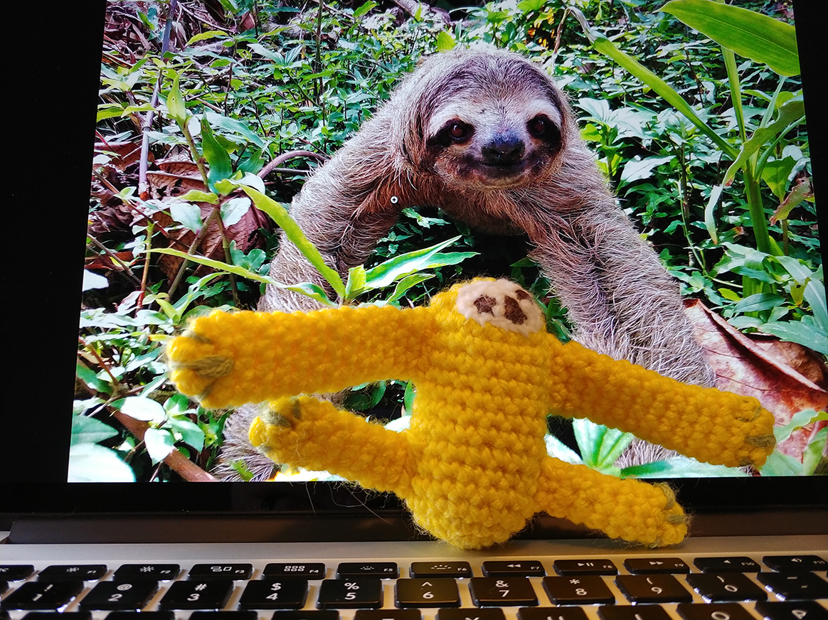 My daughter is in love with sloths!!! She loves this photo. We watched a video of Machu Picchu and there was a boy holding a baby sloth and now she is excited for when we go there because she wants to hold a baby sloth around. Here is a picture of my little sloth buddy named Sid hanging out with your entry.