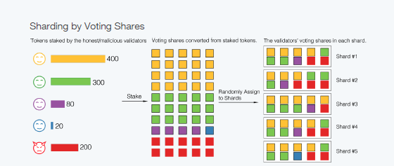 "The stakers obtain voting shares proportional to their staked tokens. Voting shares are then randomly assigned to shards. Stakers become validators for the shard(s) where their voting shares are assigned."