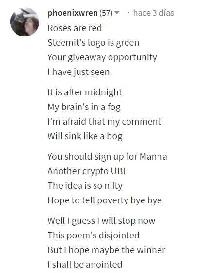 The first poem I recieved was from @phoenixwren. Without prompting, and after not having stopped by their blog in more than a month, I was very excited that @phoenixwren found my secret contest and even whipped up a few rhymes about it! (Also Manna UBI is a very interesting project!)