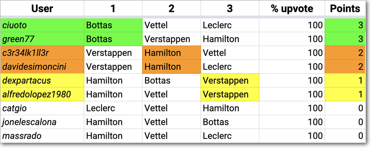 - Predictions are collected commenting on this post, for the first three classified, for example 1. Vettel - 2. Hamilton - 3. Raikkonen.