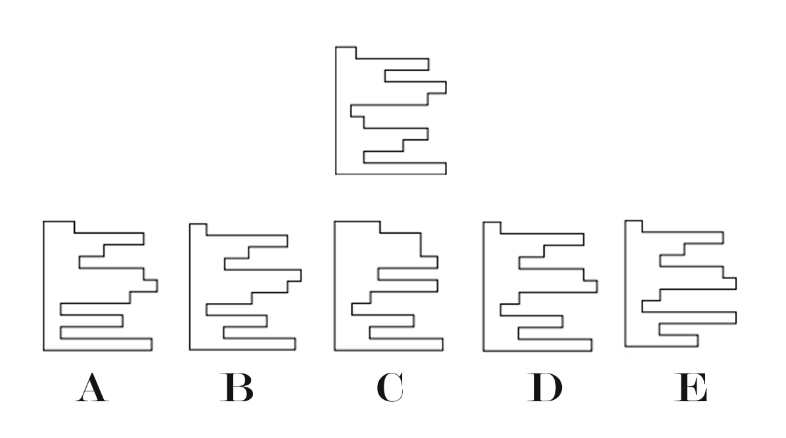 Which piece below (A to E), when fitted into the piece on the top, will form a perfect square?