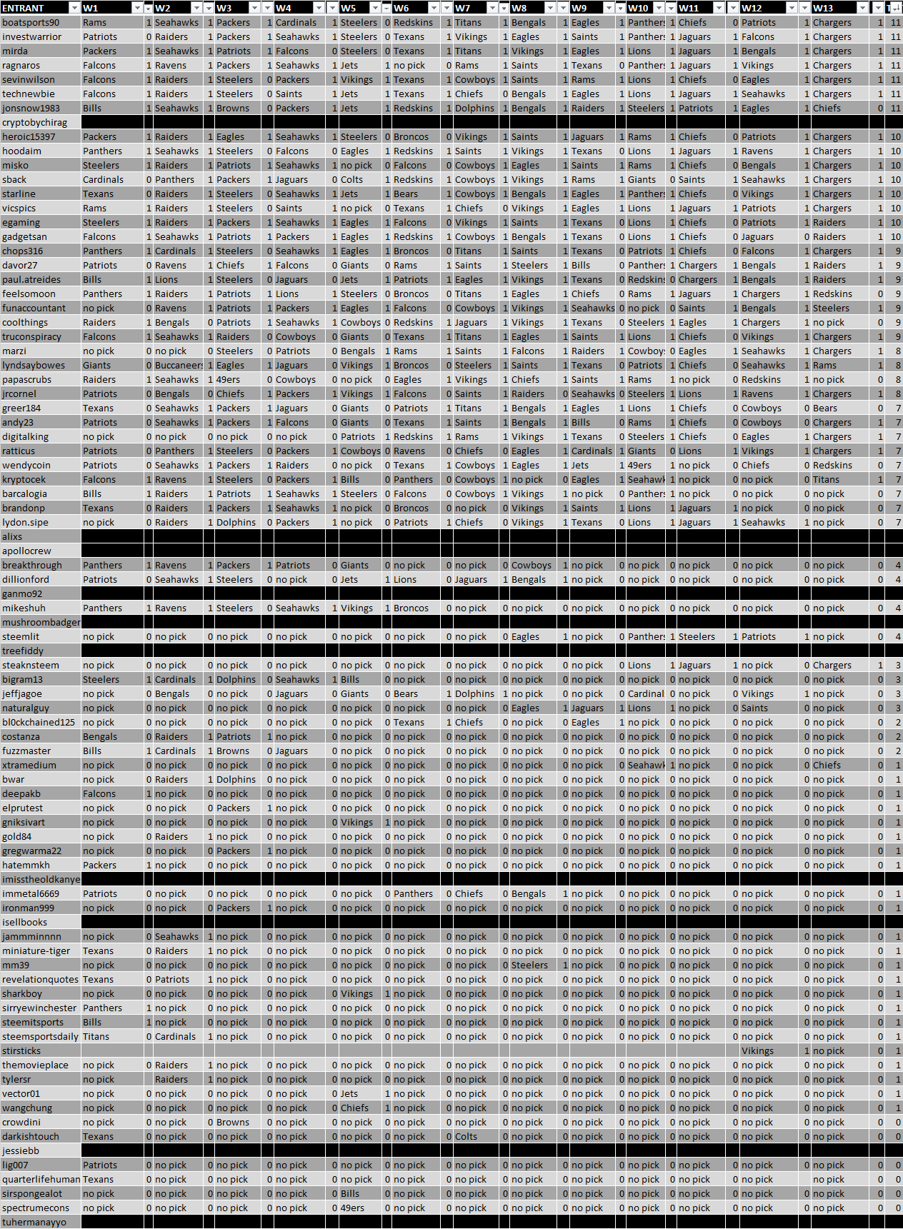 Also, the teams that you picked for weeks 1 through 13 cannot be picked again by you this season please refer to the results post each week to ensure you don't select a team that you have already selected. This will result in an obvious 0 to your score regardless if the team wins.